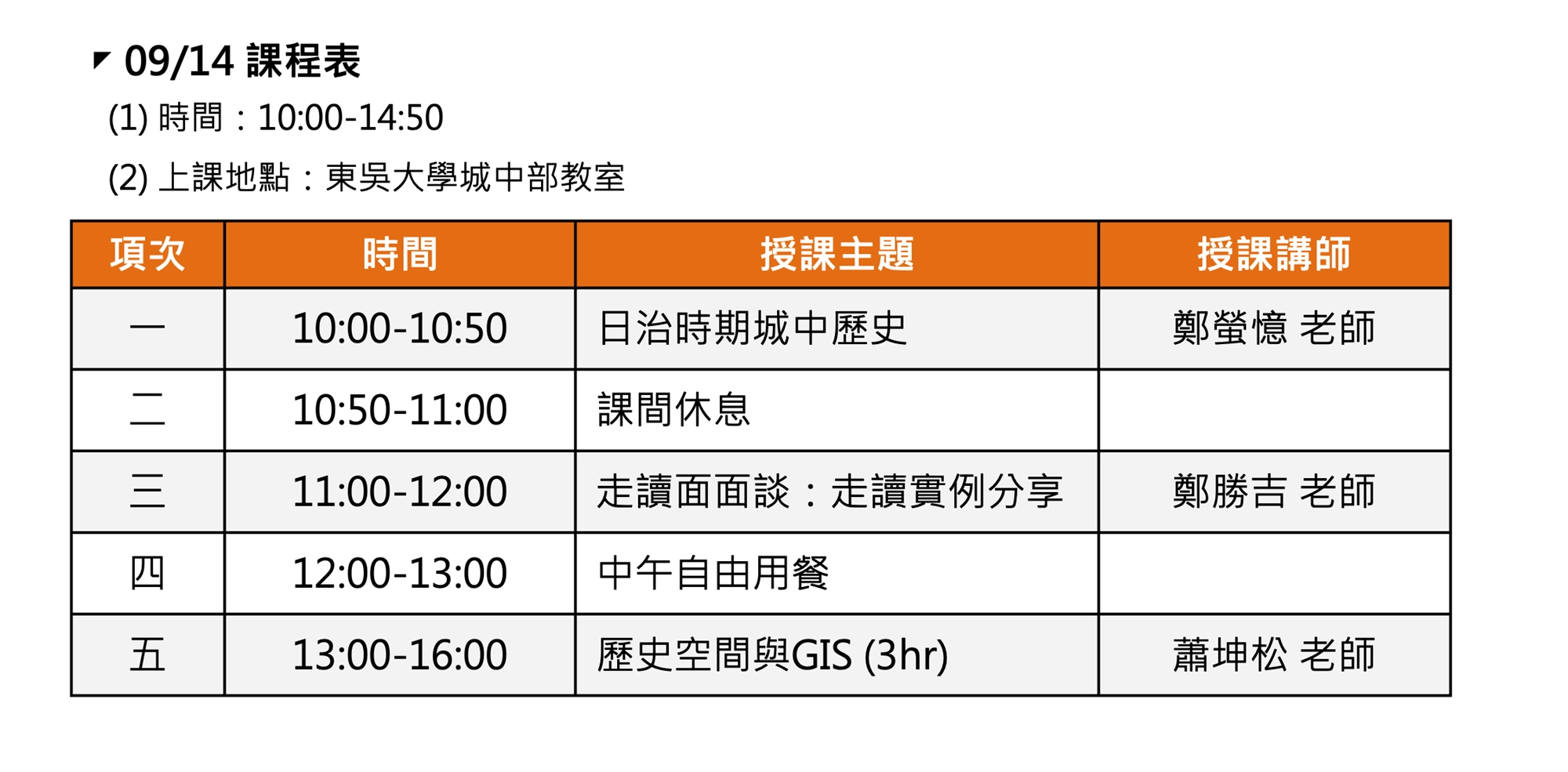 本次的工作坊課程,希望突破既有導覽模式,結合「歷史學專業」、「文化推廣導覽實務經驗」、「科技應用輔助」,開立「導覽實務培訓 (鄭勝吉)」、「歷史空間與GIS 應用 (蕭坤松)」、等深度立體導覽培訓課程!