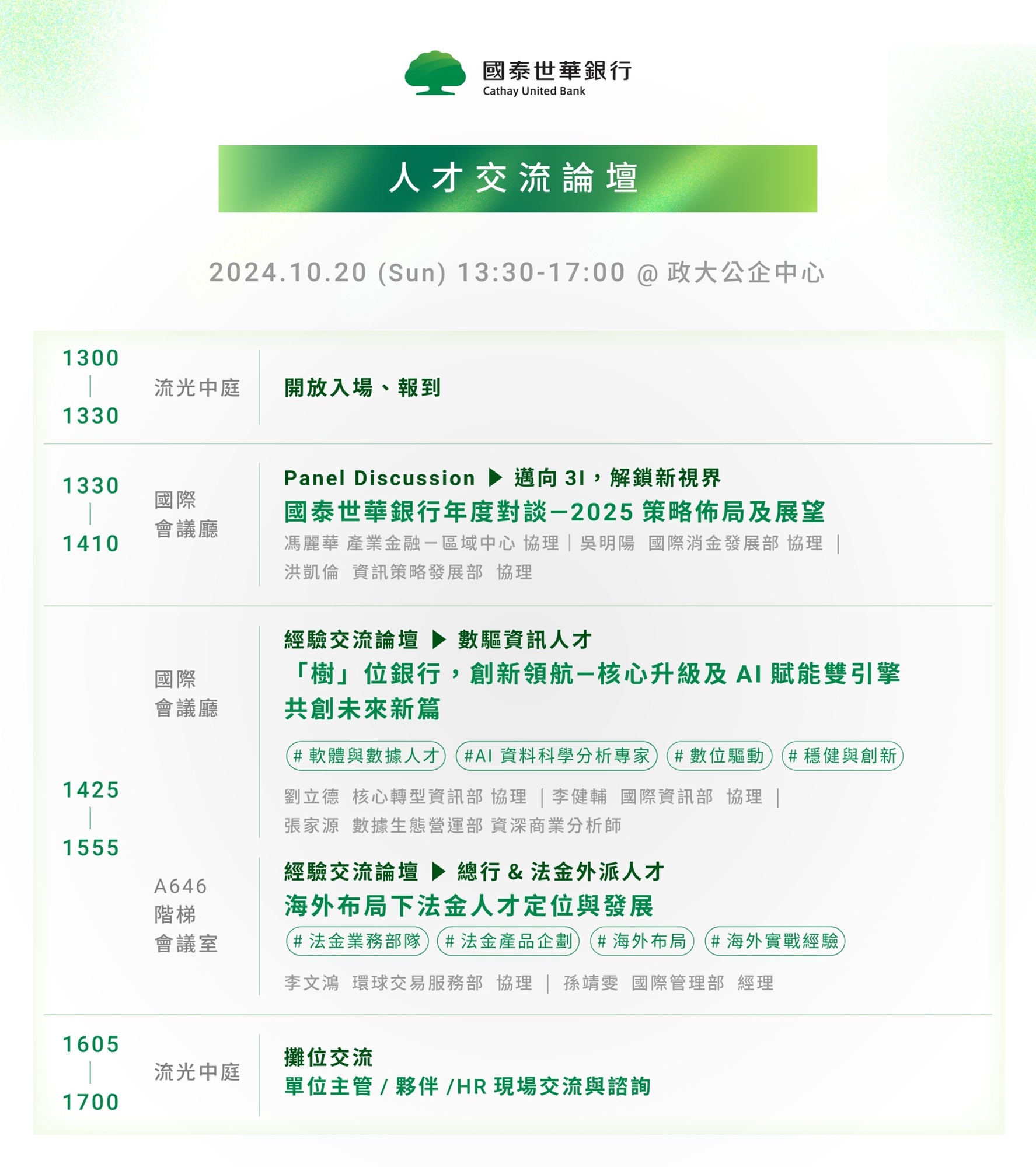 2024年國泰世華銀行年度最大人才交流論壇即將登場!交流主題涵蓋AI、IT、International(派外或對接海外據點之業務/產品PM/企劃)等領域,歡迎與國泰世華一同共創金融國際新職涯!✨✨✨