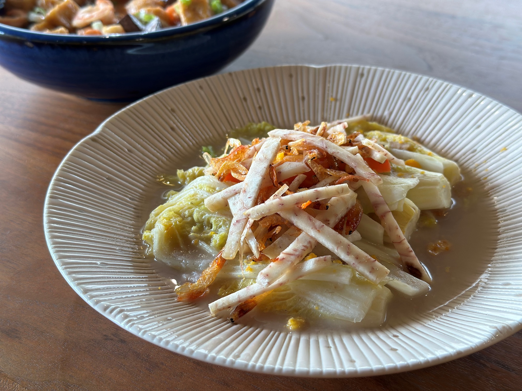 把傳統台灣白菜滷轉化增加,運用了大甲芋頭與櫻花蝦熬煮的醬料,搭配上用雞高湯燉煮的娃娃菜最後刨上鹹蛋黃碎讓整體風味層次更加鮮明!