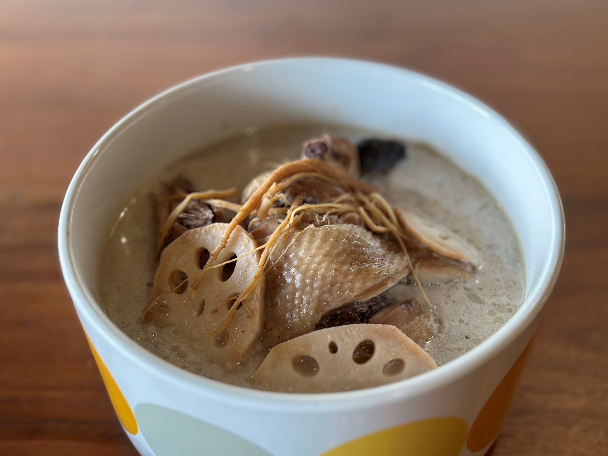 使用大溪在地天邑農莊放養歐里雞,加上人參與各式中藥和桃園在地蓮藕燉煮雞湯,也融入了南洋料理中會使用的椰奶一起燉煮出來的雞湯,象徵台灣多元族群的包容文化。