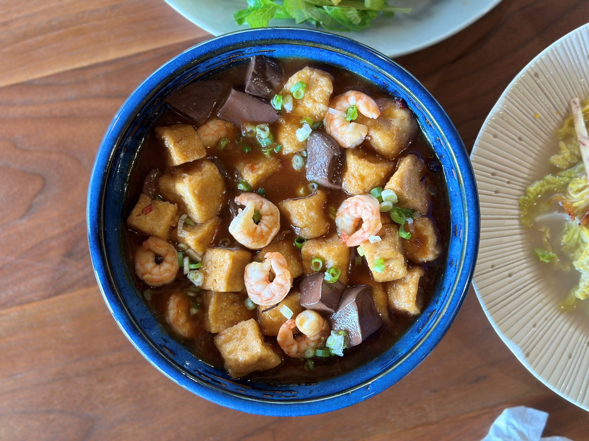 眷村傳統美食其實涵蓋了來自中國不同地區的菜系,以來自川菜的麻婆豆腐轉換加入台灣傳統酥炸臭豆腐和在地養殖草蝦,讓麻婆豆腐增添酥脆臭豆腐的口感和鮮美的蝦仁,讓眷村菜餚更加昇華!