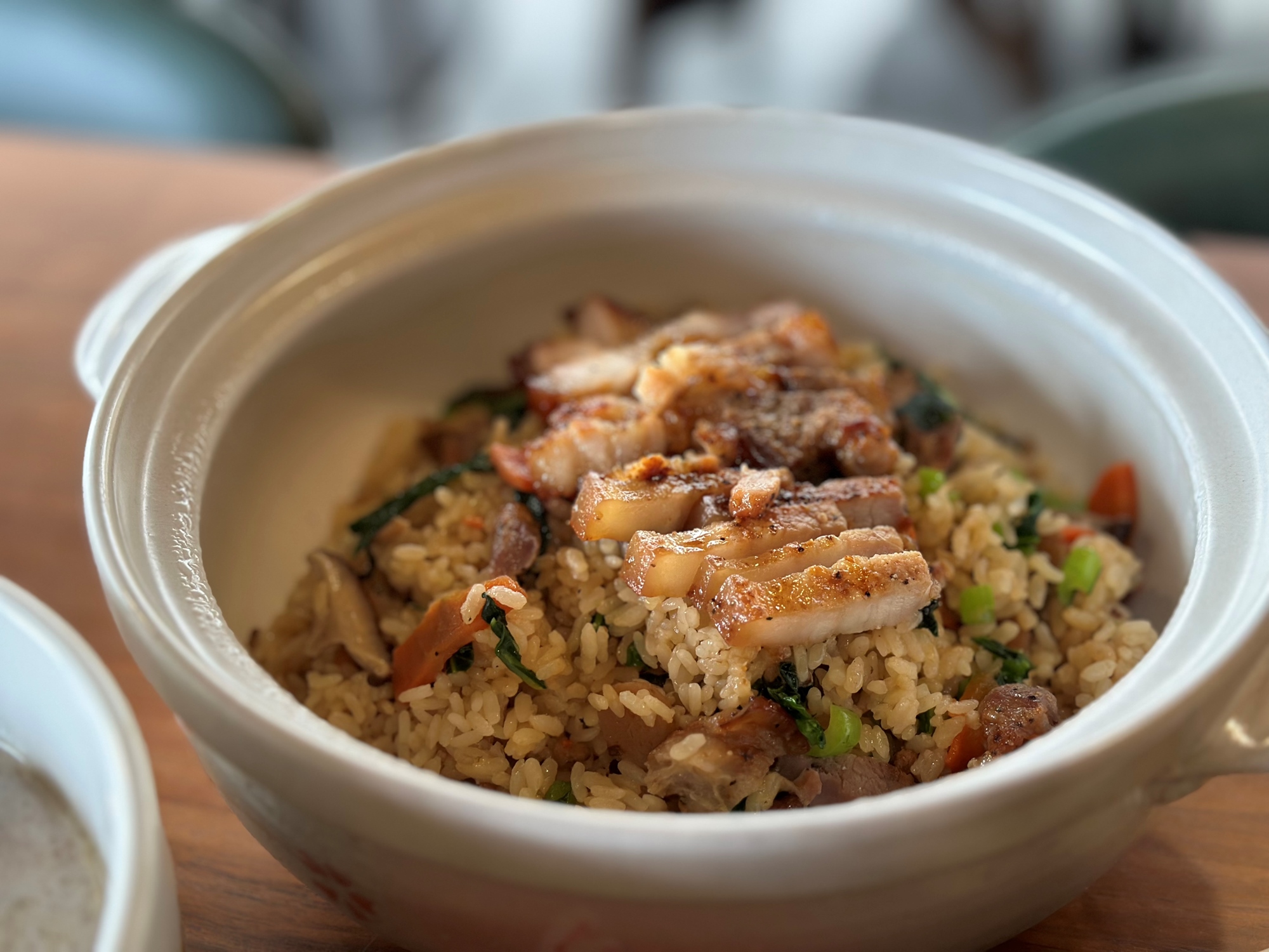 這道菜色的創作理念是將上海菜飯結合台灣原住民文化所融合出來的美味佳餚,特別使用大溪養殖黑毛豬五花醃漬後燒烤與小松菜和季節野山菜拌入花東月光米,把菜飯的風味帶出台灣豐富的山產原住民美食。