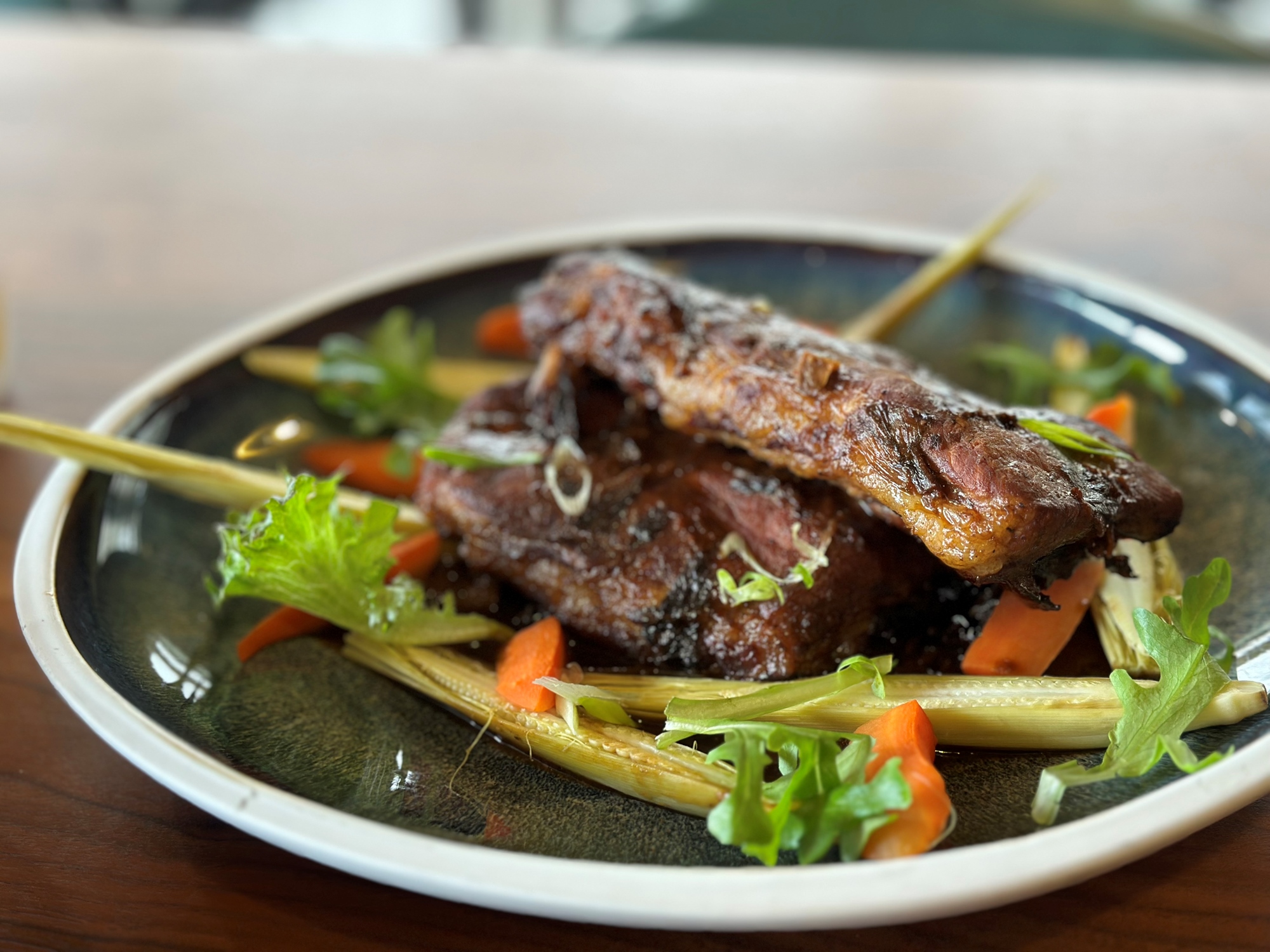 把傳統的梅干扣肉與美式燒烤豬肋排結合,利用傳統的梅干菜搭配中式滷味香料熬煮成梅干菜燒烤醬汁,再將醬汁塗抹在黑毛豬肋排上,低溫長時間烘烤讓梅干菜醬汁慢慢的滲入豬肋排裡面,使肉質柔軟多汁。