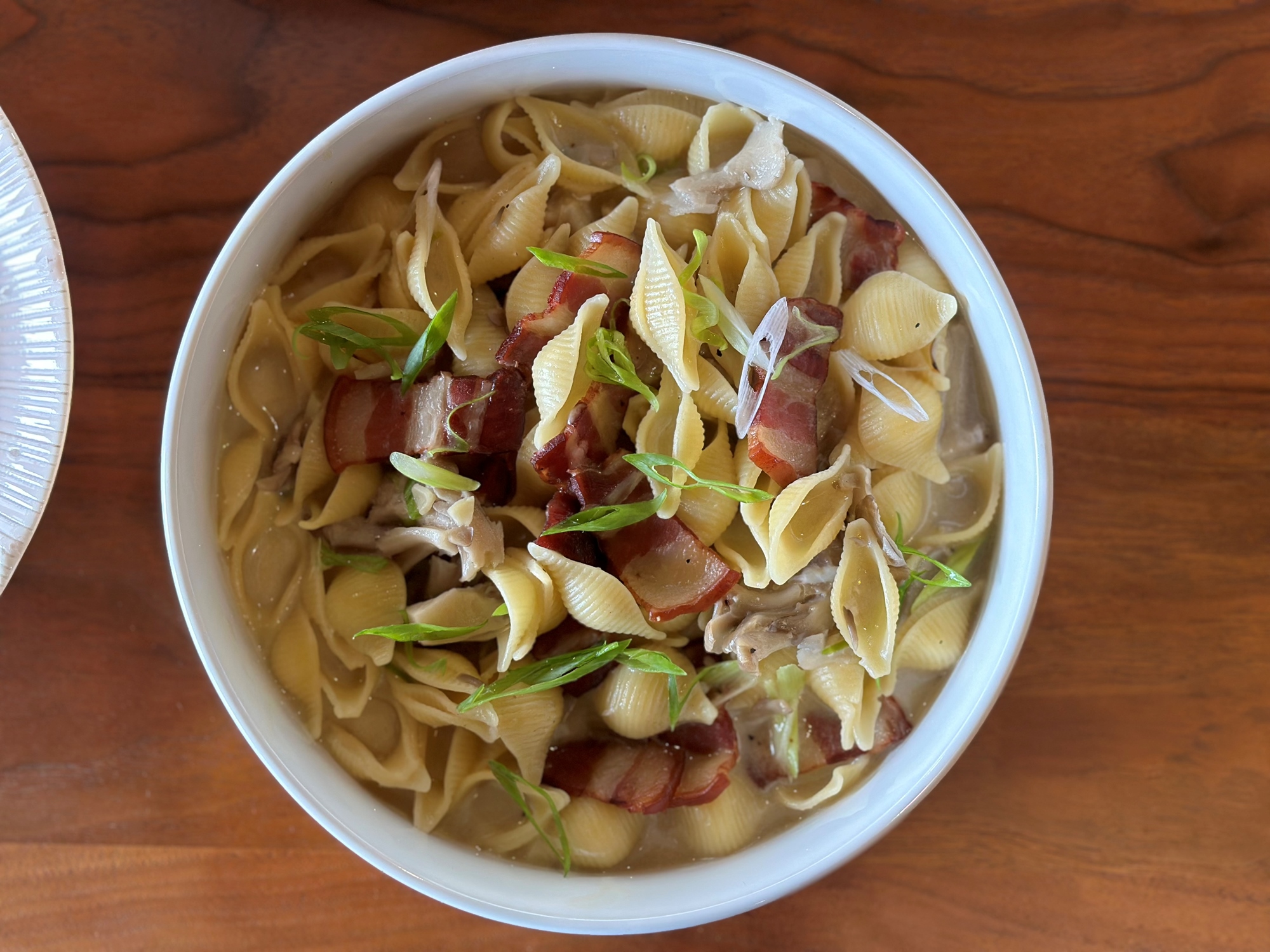 傳統眷村菜裡常會吃到的家常麵食麵疙瘩還有臘肉,這道菜將義大利經典的菜培根蛋奶麵轉化利用在地風乾熟成的臘肉與蒜苗,融入創造出眷村風味義大利美食。