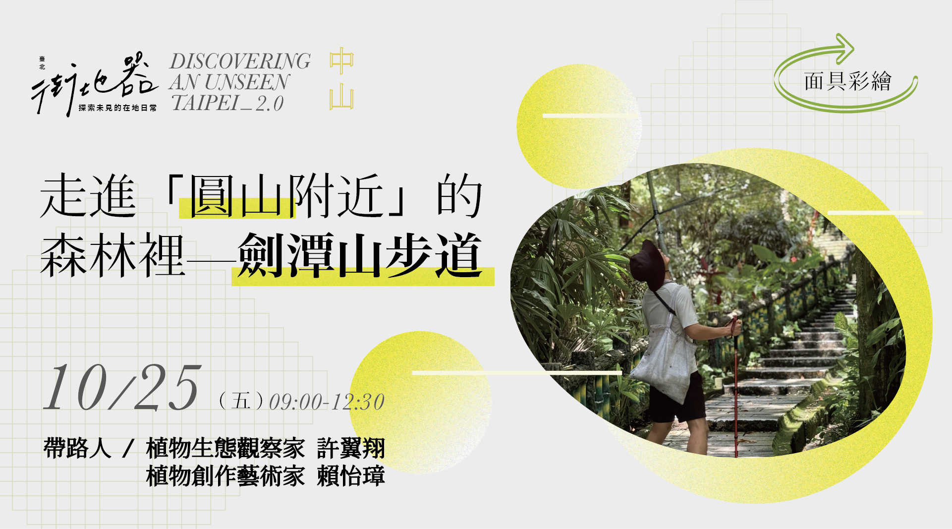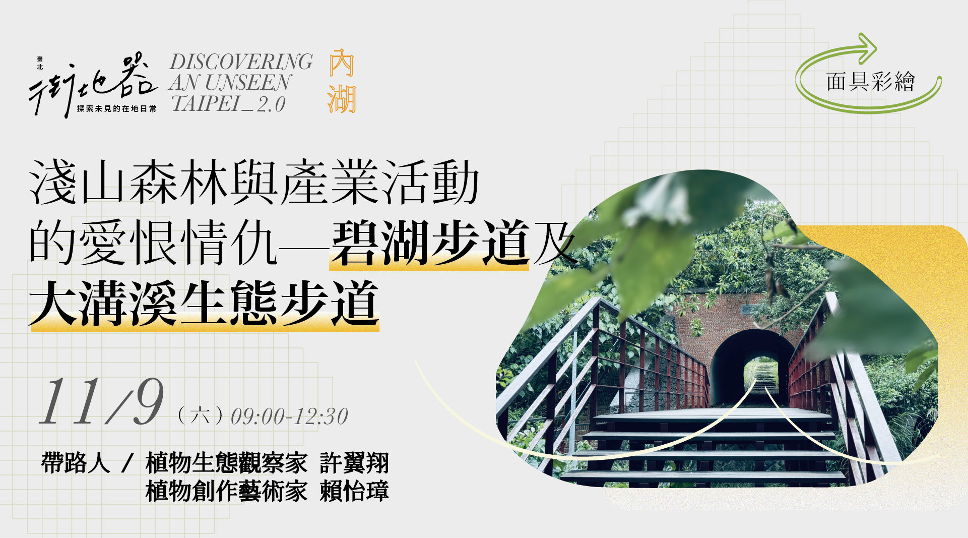 - 活動帶路人將會依當日天氣調整室內外課程的時間比例,建議穿著輕便好走的布鞋,並斟酌自備雨具、水壺、防曬、防蚊等個人物品。
