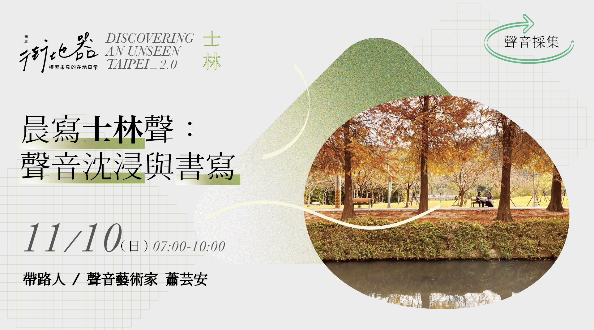 士林官邸203號公園的存在,默默地為嘈雜街道創造了一股靜謐氛圍。園區裡秋季限定的金黃落羽松與蜿蜒其間的小河道,小巧精緻的配置令人有種跳脫大都會的輕盈自在。本工作坊將引導民眾,以聽覺感知、覺察士林官邸公園的清晨聲景,結合自由書寫元素,練習以文字書寫下聆聽意象與感受,留下屬於士林官邸公園的聆聽記憶。