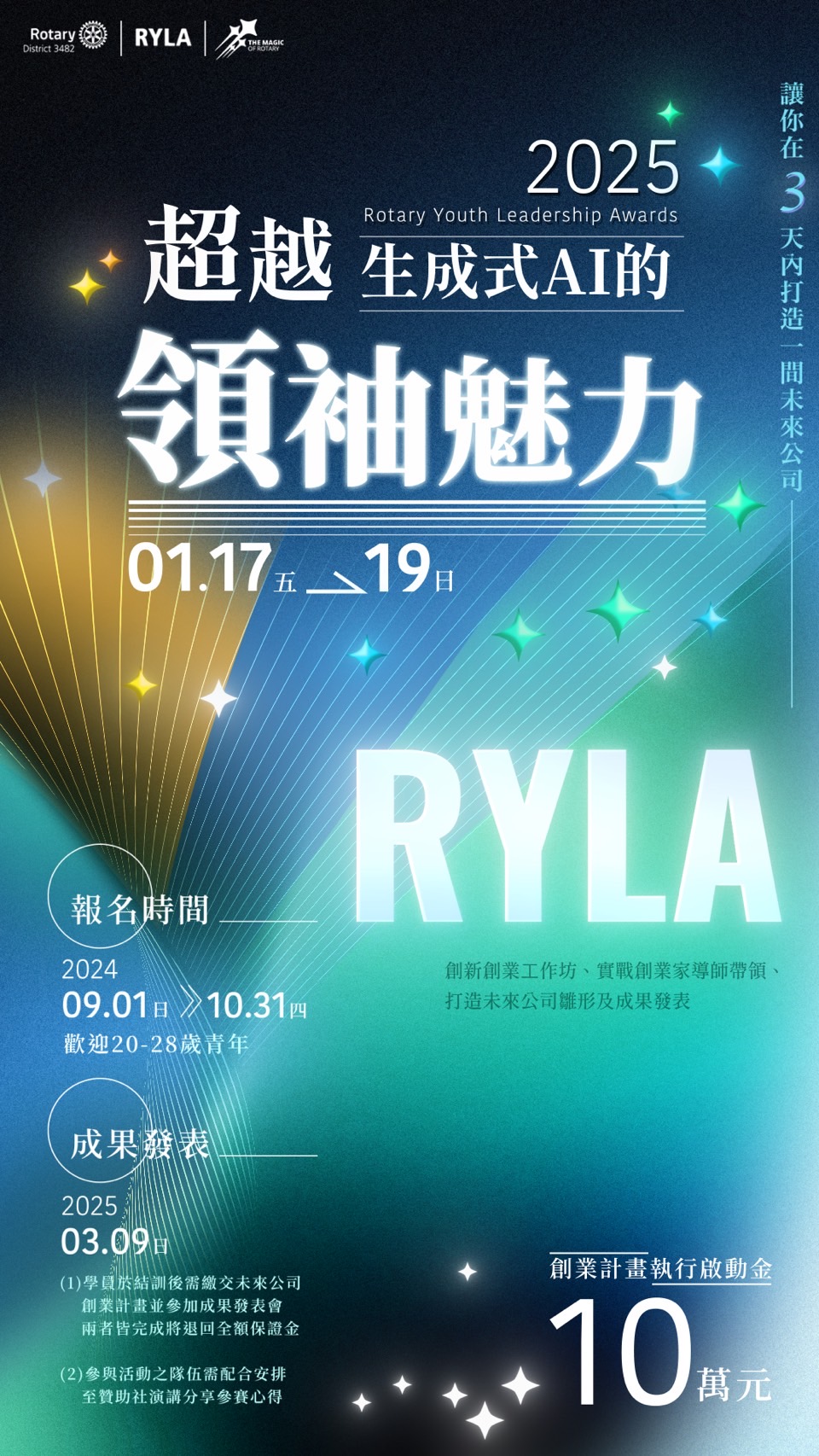 國際扶輪3482地區RYLA委員會為您精心打造的「超越生成式AI的領袖魅力」創新創業訓練營,將帶您體驗矽谷級的創業洗禮!