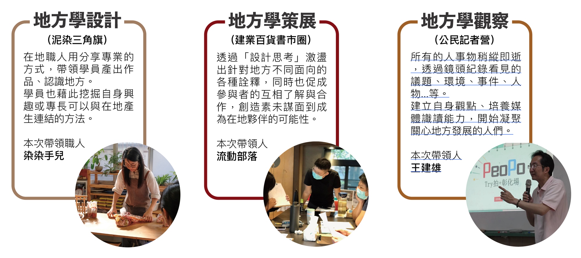 - 地方學設計9/22(9:00~12:00)、10/20(9:00~12:00)、(14:00~17:00)/三堂課程內容相同請擇一報名