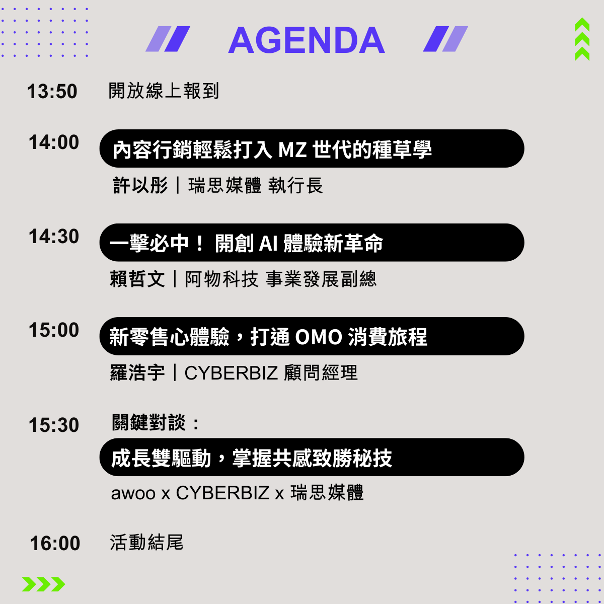 當您透過本活動報名時表示已同意蒐集個人資料,包含您提供之姓名、聯絡電話、電子郵件信箱等個人資訊,僅作為本公司、CYBERBIZ、瑞思媒體與關聯企業日後進行包含但不限於客服、媒體宣傳及行銷推廣使用、統計與研究分析。您就前述個人資料,得請求查詢、閱覽、製給複本、補充、更正、停止蒐集/處理/利用、或刪除,請來信 hello@awoo.com.tw ,將有專人為您服務。如您提供的個人資料有誤或不齊全,依實際情形可能無法參與相關活動或享有特定服務。