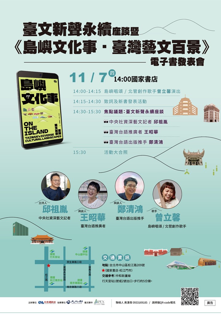 「臺文新聲永續座談暨《島嶼文化事.臺灣藝文百景》電子書發表會」於台北市松江路的國家書店舉行,將邀請北管創作歌手曾立馨為活動開場演唱,結合多元曲風及傳統北管精神,歌頌島嶼在地特色文化,並由中央社資深藝文記者邱祖胤主持,邀請前衛出版主編鄭清鴻、民歌手也是台語推廣者王昭華,共同展開「臺文新聲永續」座談,帶領讀者重新發現台語的美好。活動匯聚音樂、對談,精彩內容不容錯過!