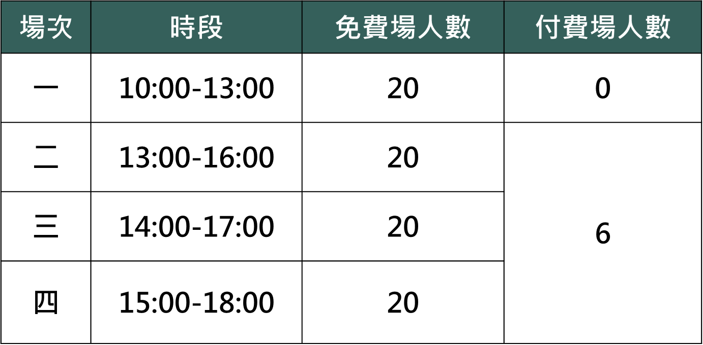 |活動名額| 免費場 80名/天,付費場 6名/天
