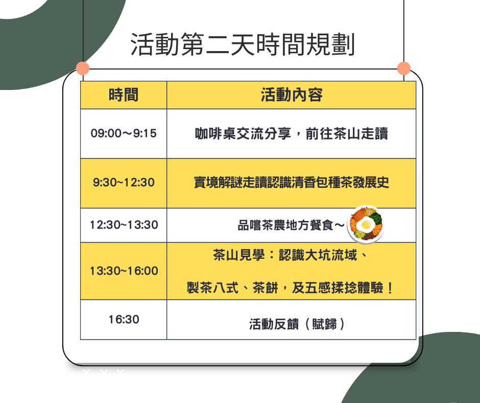 ►本活動主導覽、體驗手作工作坊+茶山文化特色地方遊程 。