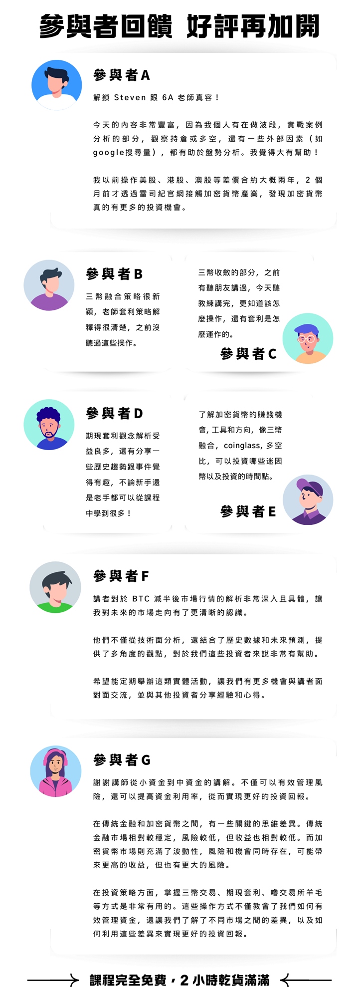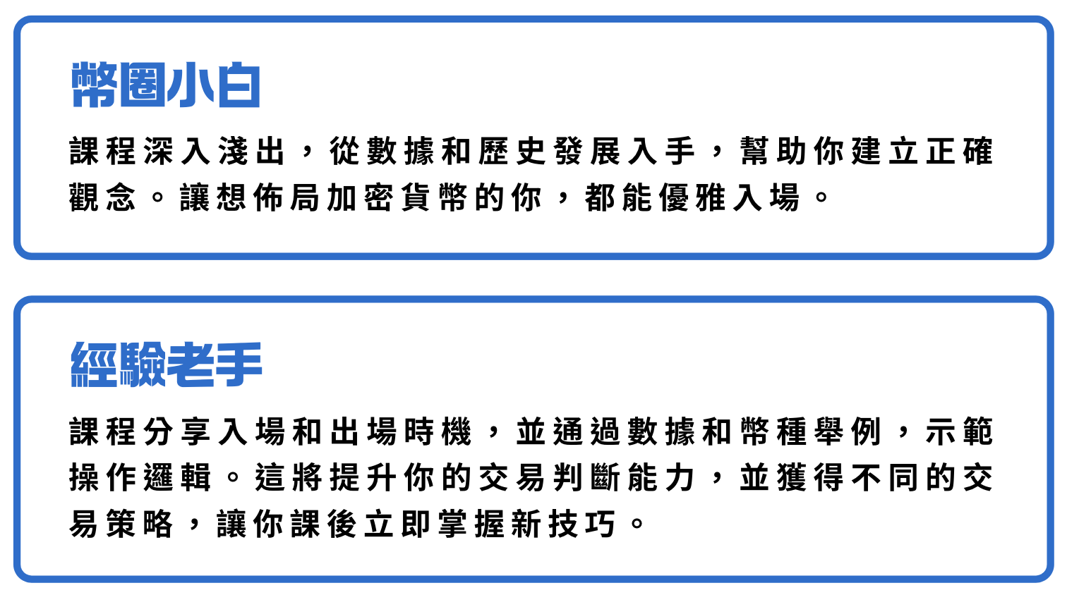 實體課面對面教學,只要 7 小時,你將學會 5+ 招加密貨幣高效實戰獲利策略、掌握幣圈市場趨勢判斷方法,並建立正確加密貨幣投資觀念,避開常見陷阱,學會控制風險。