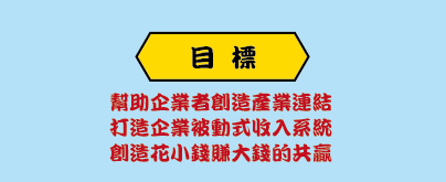 我們尋求有意願一同創業並構建被動收入系統的夥伴。如果你希望賺錢,或者想為自己的產業創造被動收入,我們需要像你這樣的人才。目前,我們正在招募股東,不需資金投入,只需「觀念一致、願意推廣、擁有知識內容及商業道德」。有興趣的話,歡迎線上約聊。