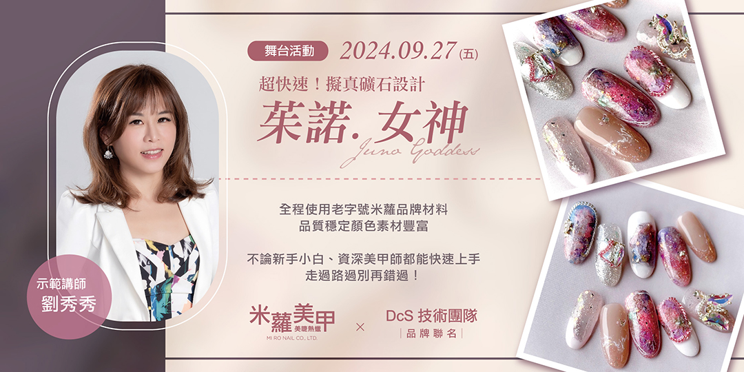 由陳家祥-達利老師帶領的DcS技術團隊,超高人氣劉秀秀講師,來幫大家示範新穎有趣的美甲款式《茱諾女神》