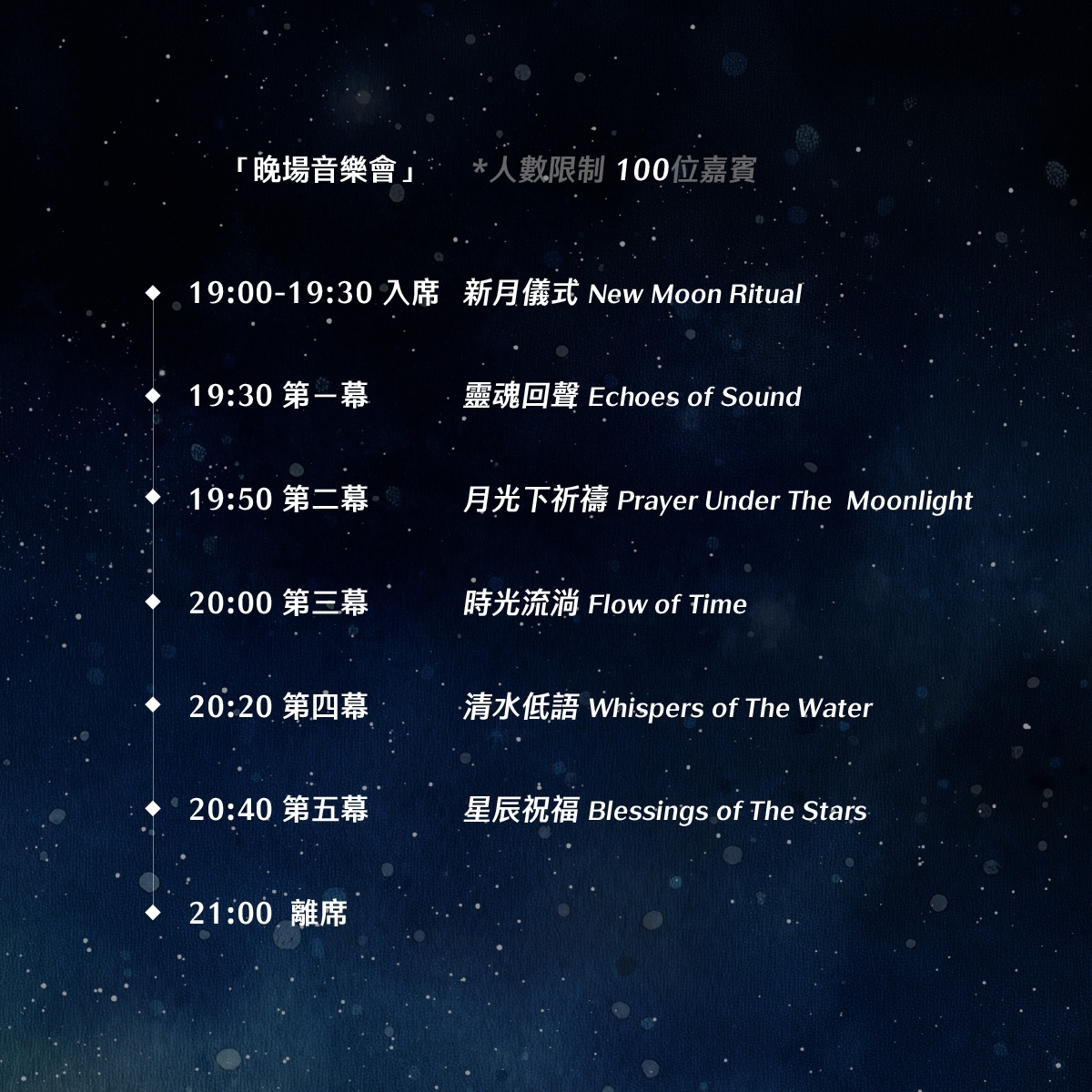 在這場音樂晚會中,您將欣賞到Nepal Sounds與Blue Moon心靈音樂團隊以及多位靈性表演者的精彩演出。這是一場讓您在截然不同的神聖音樂氛圍中,享受心靈升華的獨特體驗。