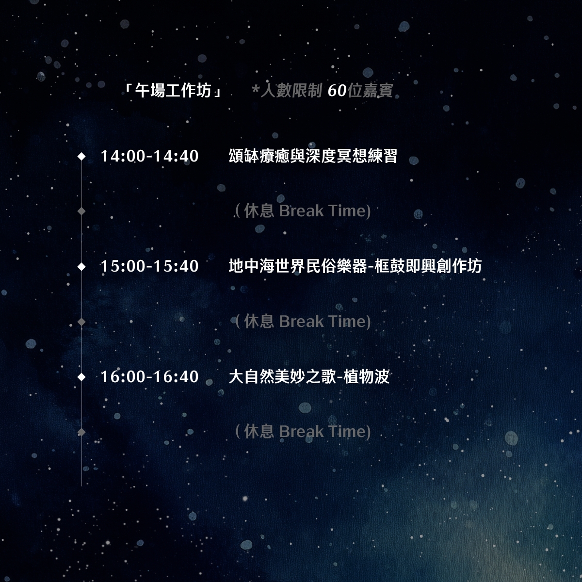 本次活動旨在讓您透過聲音療癒的力量,找到內心的平靜與和諧。不論您是聲音療癒的初學者還是已有經驗的愛好者,這都是一次不可錯過的機會!快來與我們一起探索聲音的奧秘,讓您的靈魂得到深度的滋養與啟發!