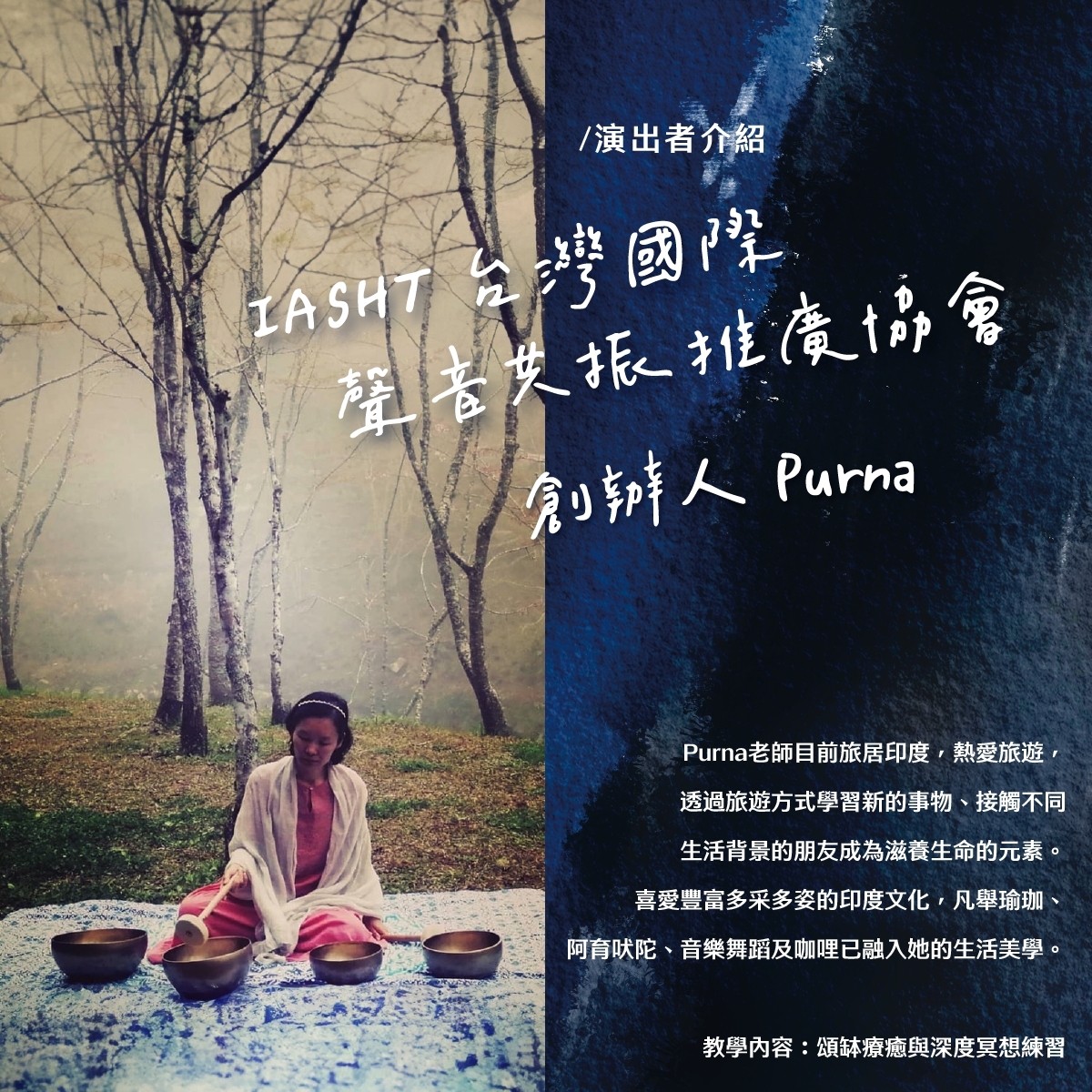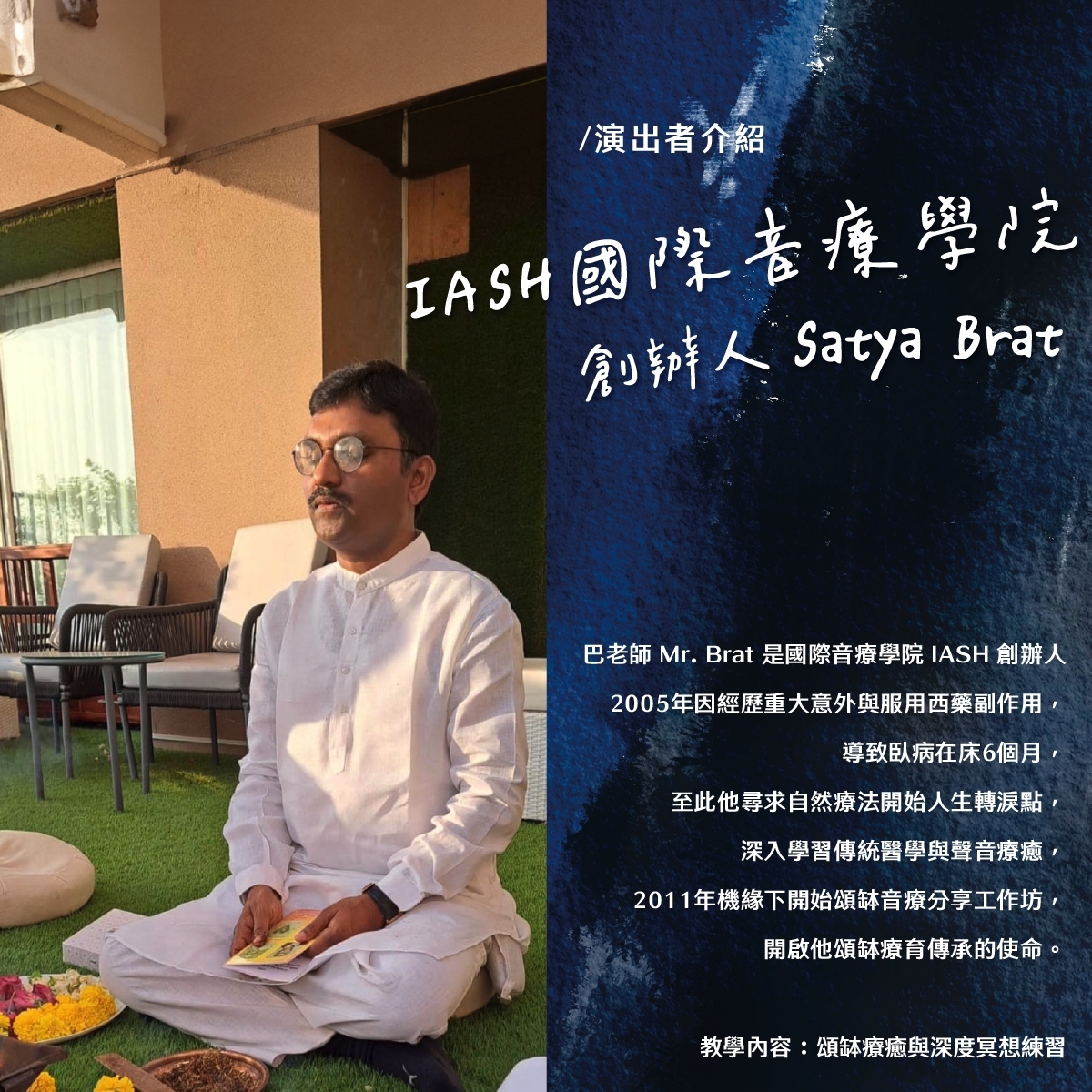 本環節將由IASH創辦人Satya Brat和台灣協會理事長Purna帶領,透過頌缽的振動與共鳴,幫助您釋放壓力,進入深層的冥想狀態。這不僅是一次身心的放鬆,更是一次靈魂的覺醒。