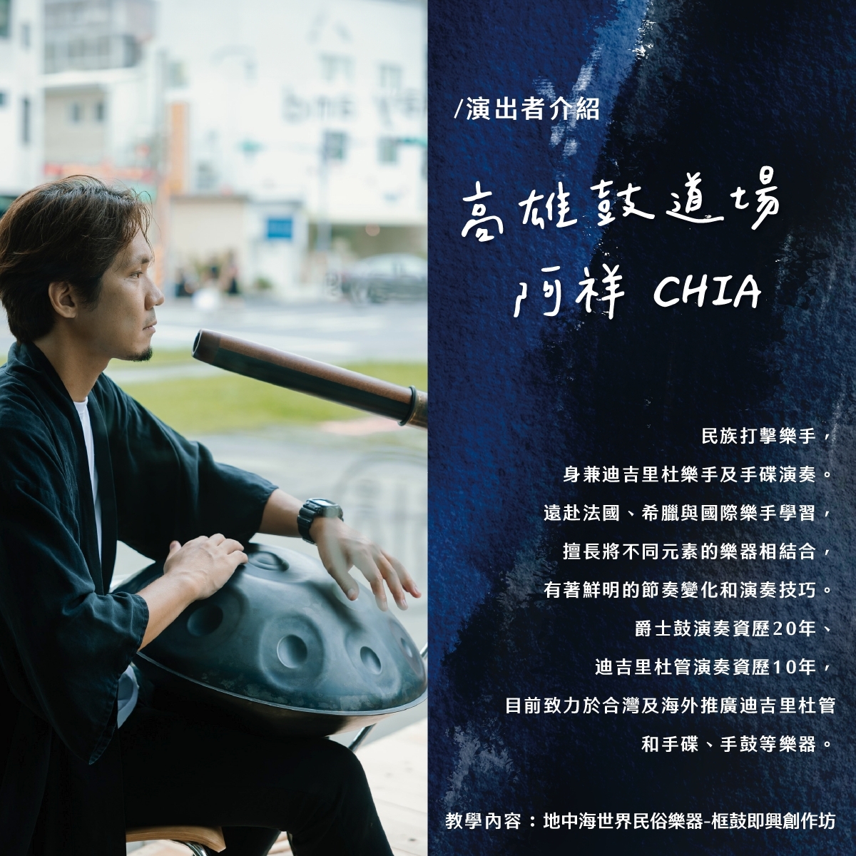 由高雄鼓道場的CHIA指導,這場工作坊將帶領您學習框鼓的基本技巧和即興創作。CHIA曾參與國慶演出及法國藝術節,對於節奏和音樂的理解,必將為您帶來全新的體驗。