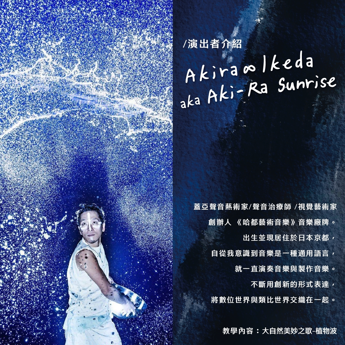 日本京都音樂藝術家Akira透過植物的聲音與能量,帶您感受大自然的美妙旋律,讓心靈在自然的音波中自由翱翔。