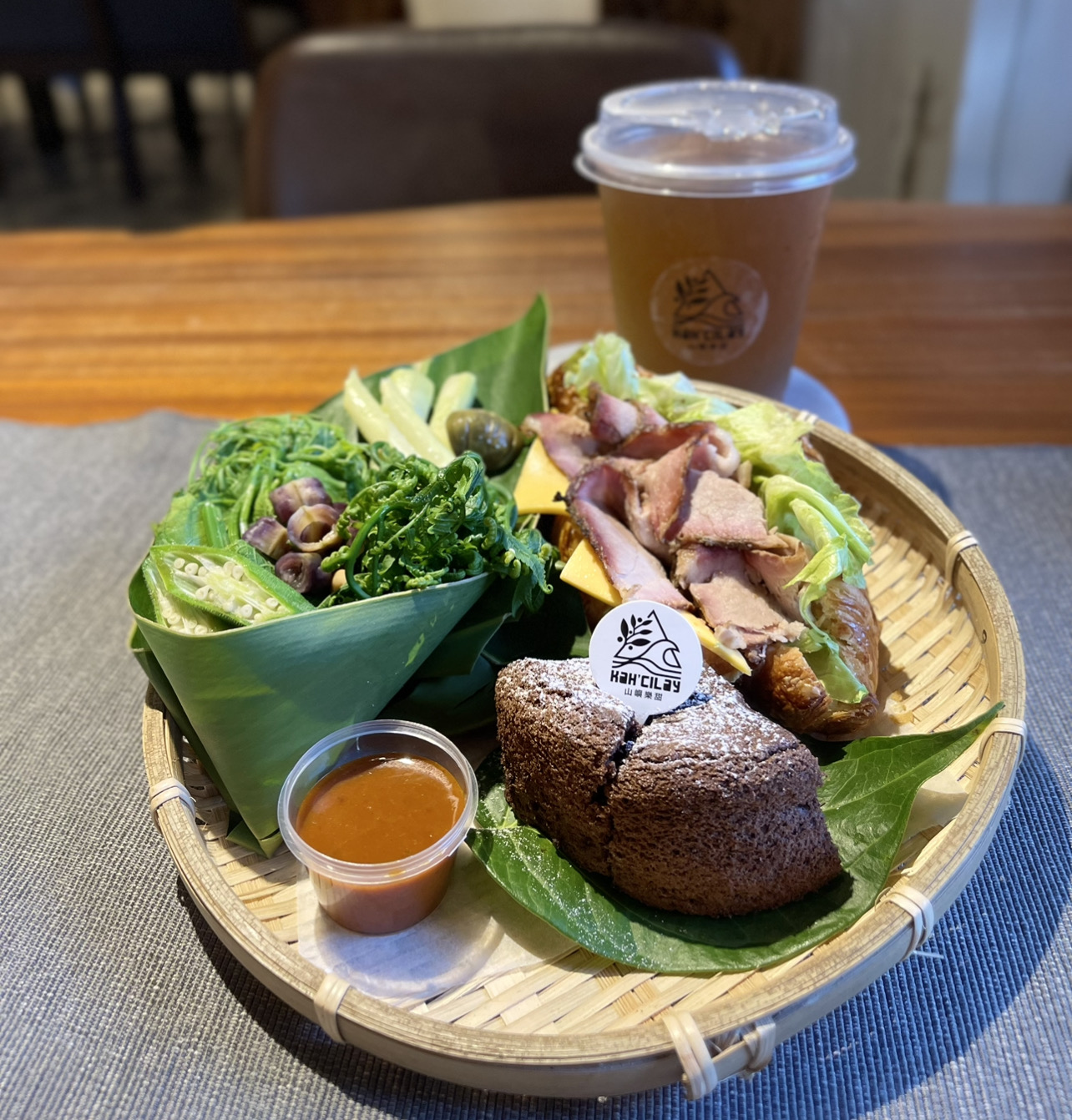 梅花燻肉起司小可頌 (或刺蔥雞胸肉起司小可頌)、野蔬沙拉附風土沙拉醬、荖葉可可小蛋糕、