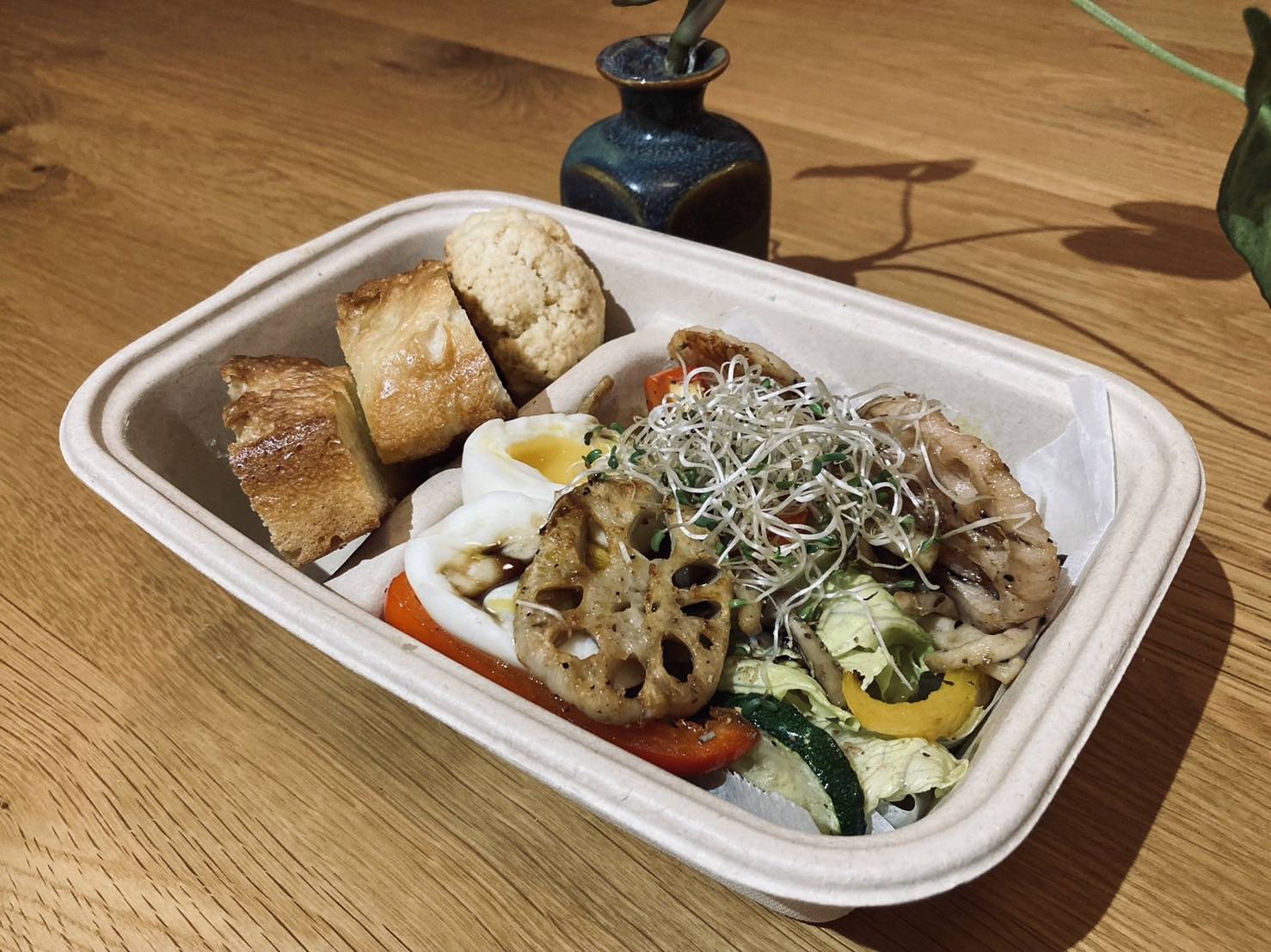 煎烤食蔬、綜合沙拉菜、溏心蛋、培根肉片、香料奶油麵包、紅糯米司康、紅藜茶