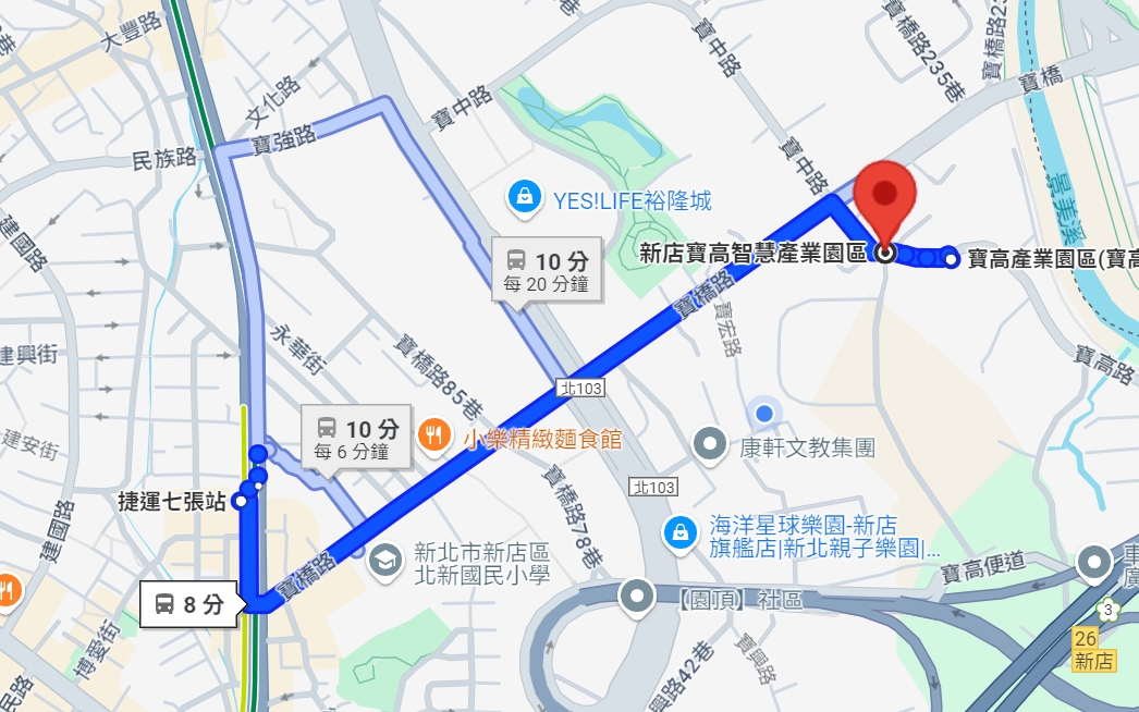 (3) 於七張捷運站1號出口對面公車站,搭乘793、796、252、819 至寶高科學園區站下車,再步行3分鐘抵達園區