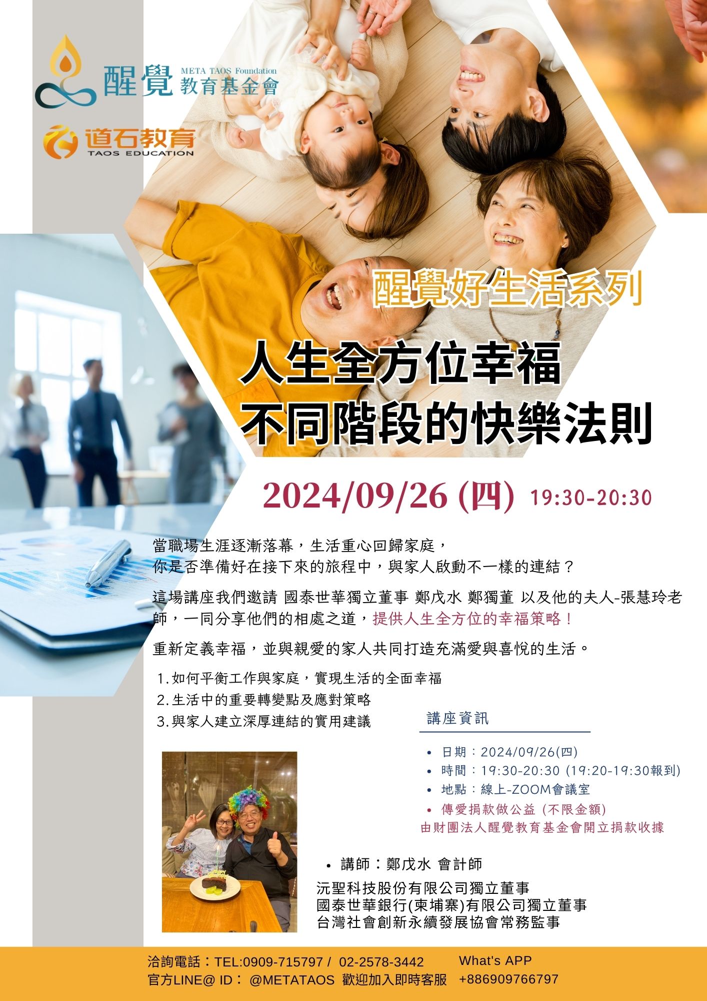 這場講座我們邀請 鄭戊水 會計師以及他的夫人-張慧玲老師,一同分享他們的相處之道。提供人生全方位幸福策略,與家人建立更加深厚的關係,並在每一天中找到滿滿的幸福。