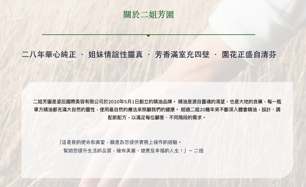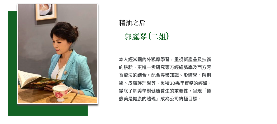 來自台灣本土的精油領導品牌-二姐芳園的總經理郭麗琴,透過長達三十年的臨床實務經驗,更結合了東方的【經絡學】、【陰陽五行】,以及西方的【解剖學】、【型體學】,融合而成的整體醫學,再透過芳香療法,不斷的在幫助需要的顧客,深入地解決問題。
