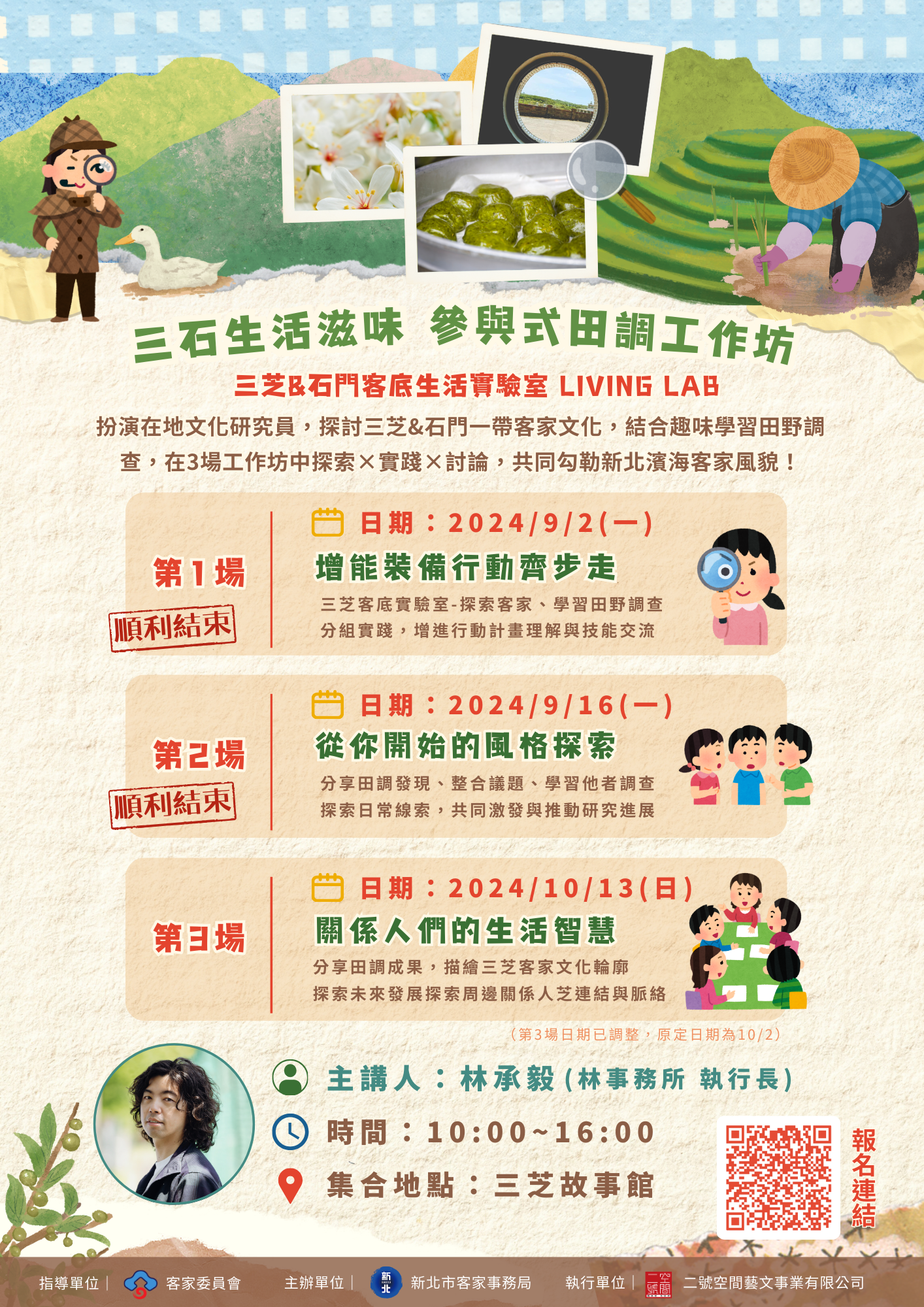 3場系列工作坊將由體驗設計專家,也是地方創生推動者,林承毅老師來擔任講師,透過工作坊的帶領,讓我們一同從參與中來領略文化之美,共同凝聚三芝人的認同,一切就從行動中展展開。參與者將學習可延用至生活中的田野調查技巧,並共同梳理與描繪三石地區客家族群的生活樣貌與文化風情。
