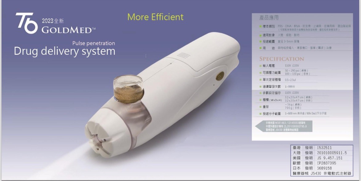 京華堂在2005年開發出國際間唯一獲得氣體霧化的投遞專利技術,目前已開發出第六代的設備,擁有安全及更高效率的設計將100Psi /CO2壓力產生出405m/Sec超音速度/產生80dB及5~20次/秒的震波頻率。將小分子產品霧化射出的高效吸收投遞工具,無創無痛無熱原不會破壞產品特性。可應用在小分子特性物質的經皮吸收投遞使用,搭配高質汽化金粒的鏈結可提高產品質量、增強滲透率。