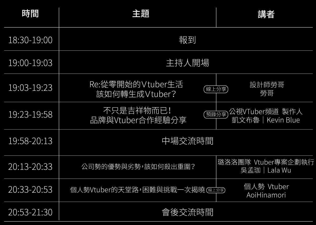 活動時間:19:00 - 21:00(18:30 現場開放報到)