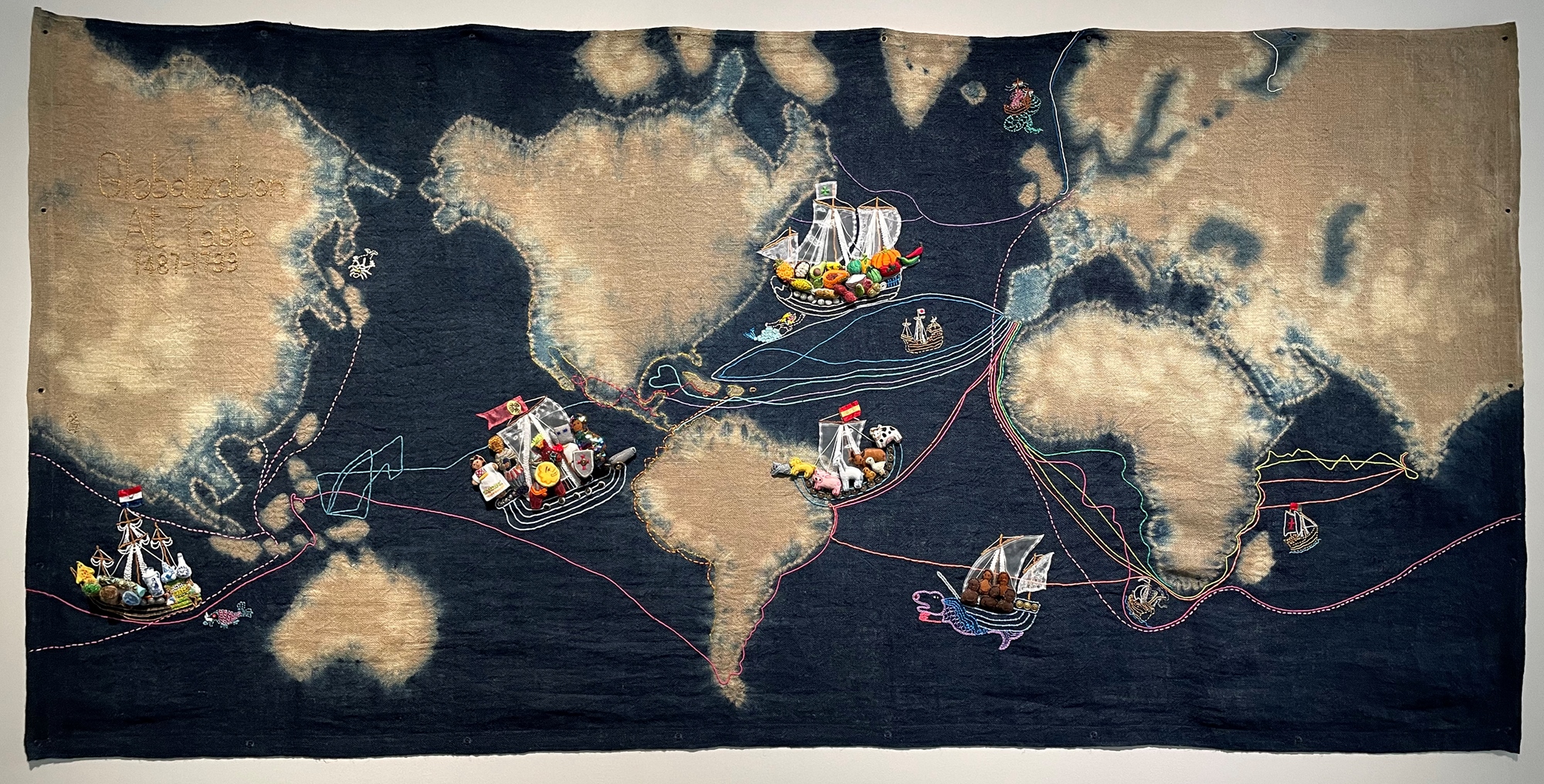 2023 年,鄧文貞前往美國洛杉磯駐村,以哥倫布所揭開的大航海時代與其帶來的全球化影響為主題,創作巨幅世界地圖作品《餐桌上的全球化》,以軟雕塑呈現各色人種、動物和農作物等,在可愛多彩的形象之下,其實是列強對人權與土地資源的掠奪和輸出,使全球飲食文化產生莫大改變和融合。