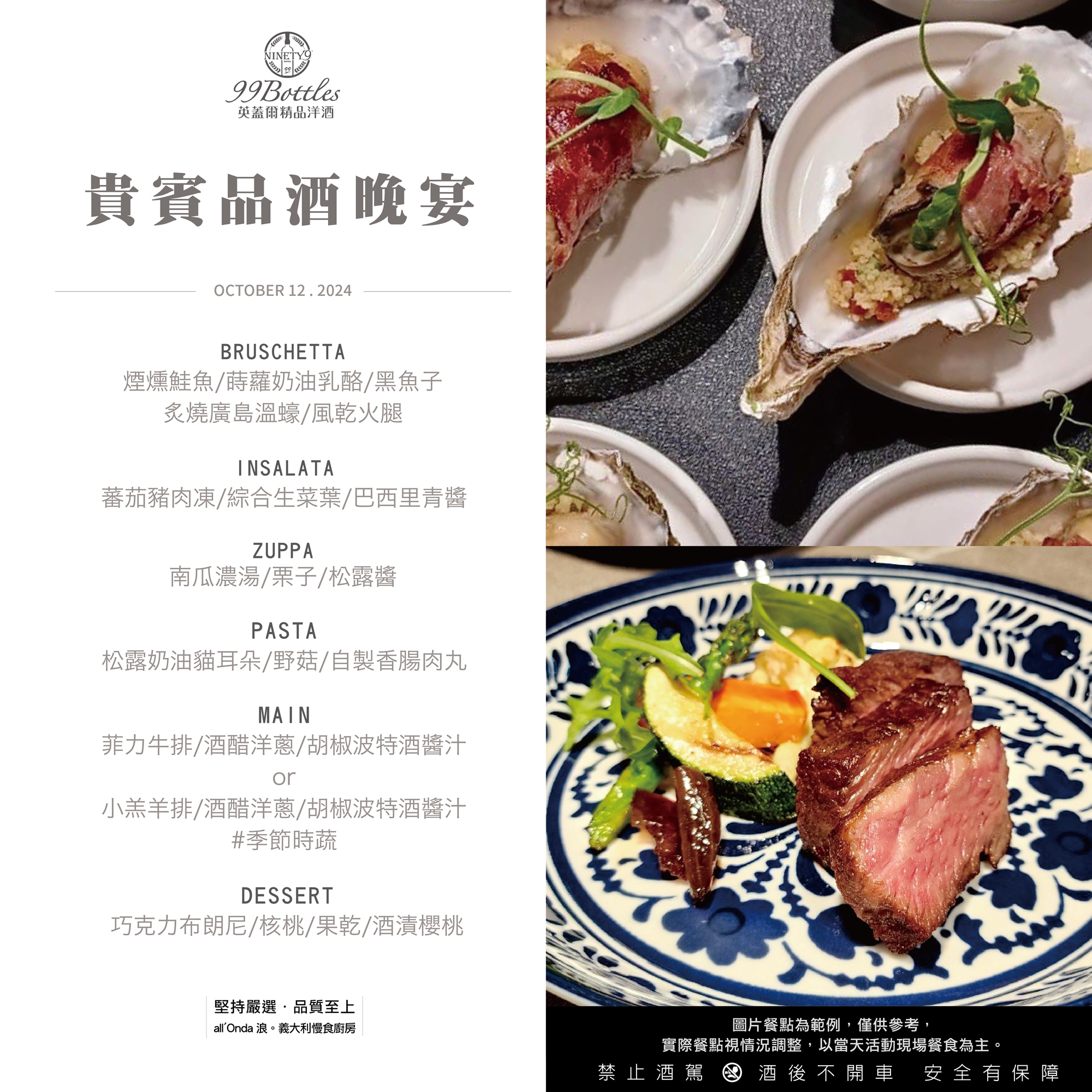 - 精選來自歐美洲的紅白葡萄酒,搭配精心準備的秋季餐點,為您的味蕾帶來無與倫比的感官饗宴。