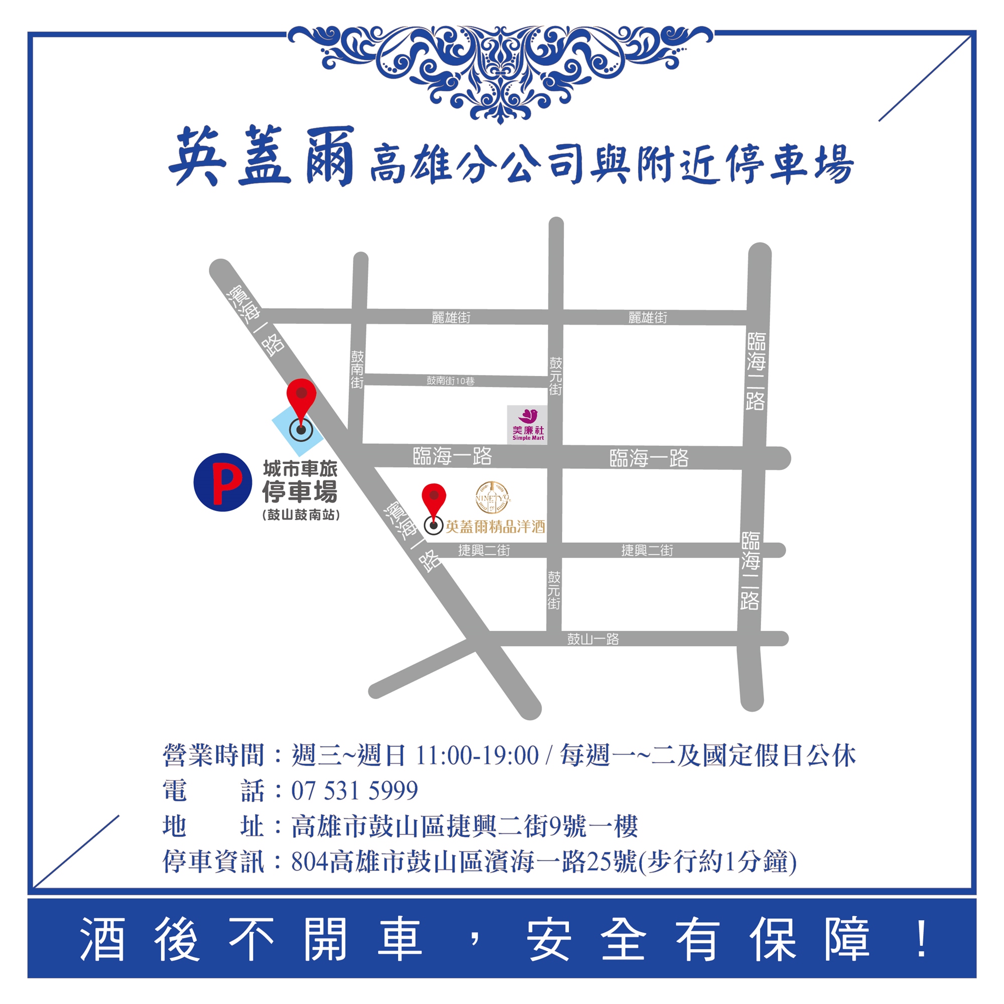 ★飲酒請勿開車,可協助代叫計程車/代駕服務。