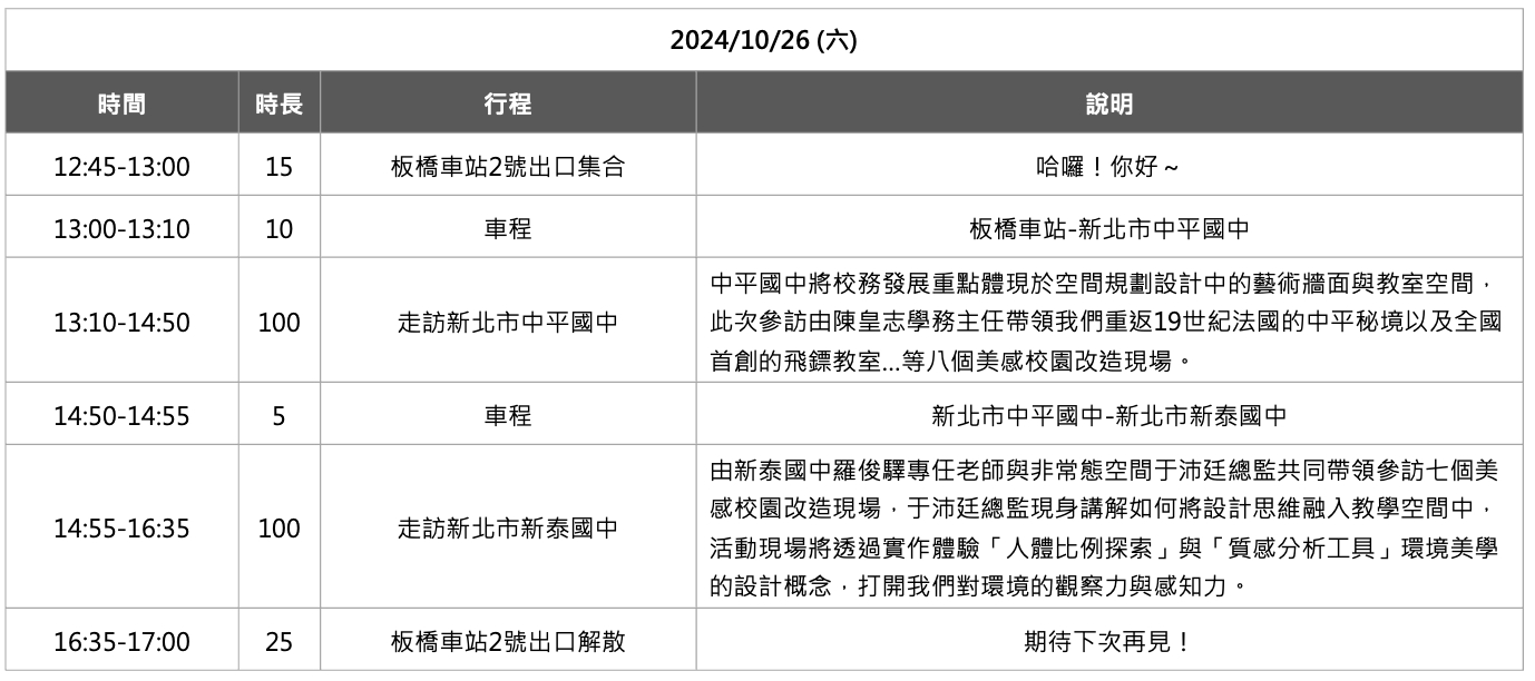 透過實地走訪美感校園:新北市新泰國中、中平國中,現場與專業人士對話探討設計思考的脈絡,深入瞭解改造歷程中的學習激盪與觀念交換,開啟你對校園美感實踐的全新視野!