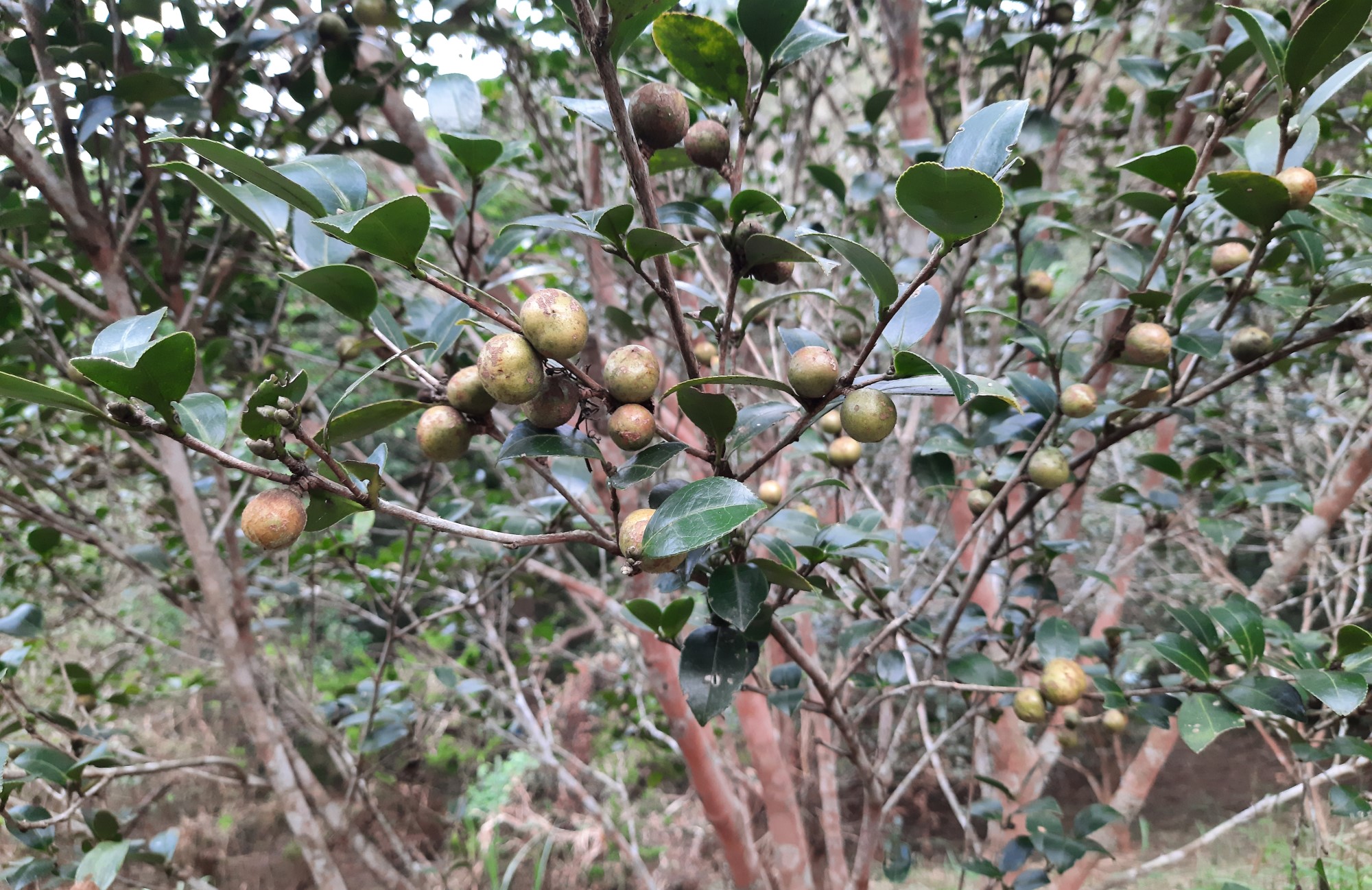 我們在頭屋基地的淺山林,有著一小片苦茶樹林,秋天一到,樹上可見結實累累由綠轉紅的小果苦茶籽,此時正是採收苦茶籽,榨製苦茶油的季節。