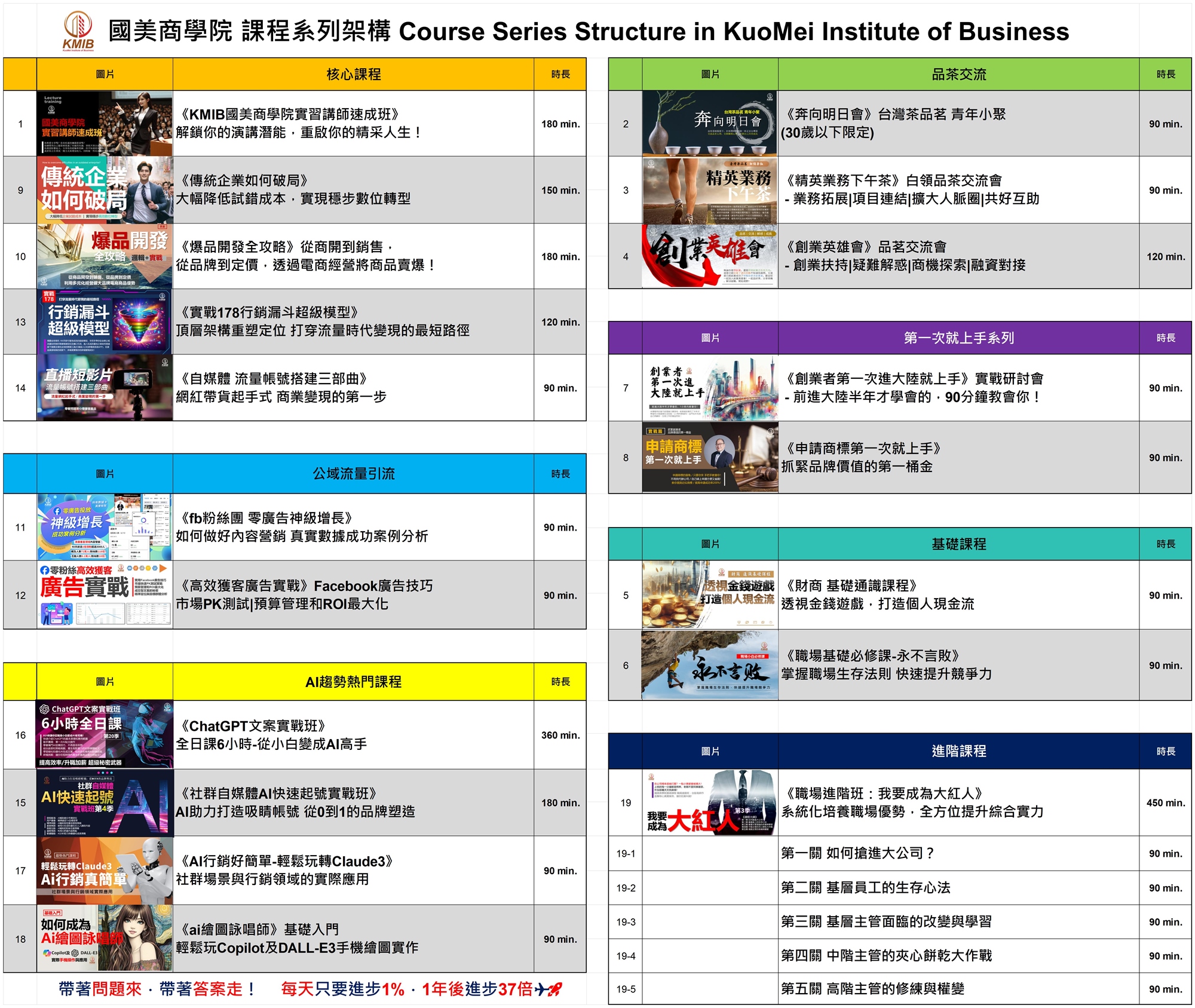 4.KMIB國美商學院成立至今,課程已涵蓋:創業修煉、趨勢熱點、財商、品茶交流、職場進階、數位轉型全攻略及AI實戰應用等共20堂以上課程,由行業大佬、創業家及專業人士擔任特聘講師。內容以「實戰好用」為主、「有效方法論」為輔;服務宗旨是「帶著問題來,帶著答案走」。協助創業者及上班族改變認知、提高視野與疑難解惑;為企業主提供數位轉型新選擇,教您做私域流量變現/品牌/商品/打造老闆IP,獲取精準客戶、經營企業粉絲,在流量時代協助您的事業再攀高峰!