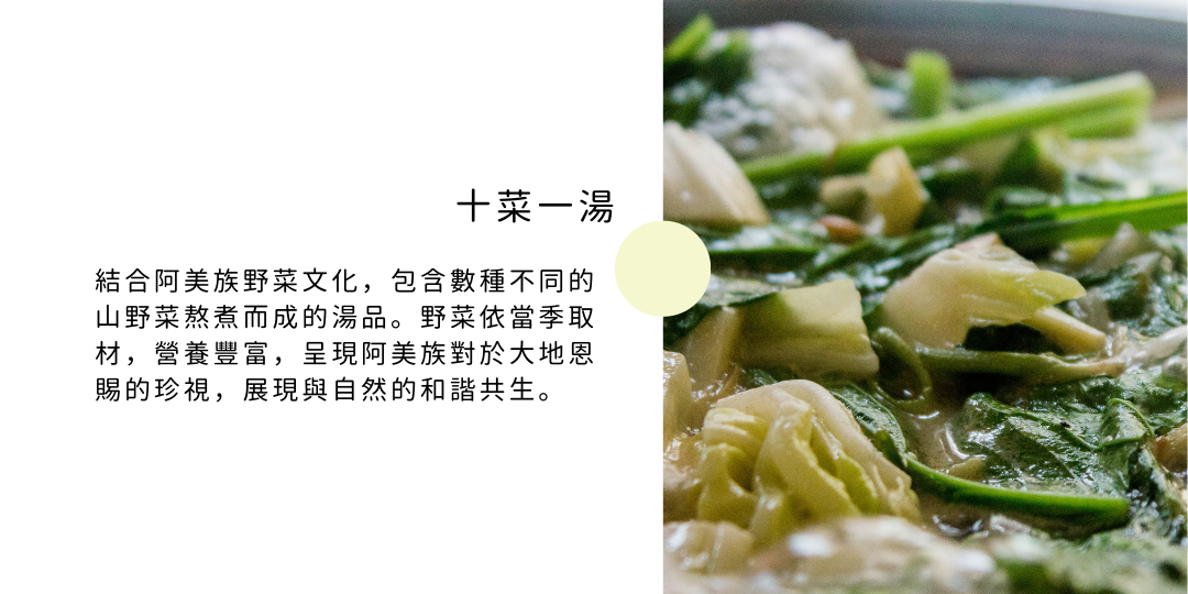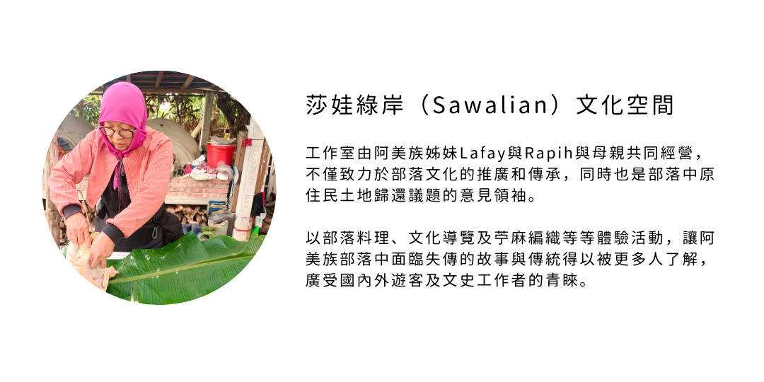由莎娃綠岸文化空間的阿美族姐妹 Lafay 和 Rapih 帶領——妹妹 Lafay 將透過她的親身經歷,帶大家認識女性在部落事務中的重要角色,並分享身邊那些令人振奮的生命故事,探索不同身分女性所面臨的挑戰。Rabih 則負責料理,帶領大家親手製作阿美族傳統菜餚,包括「十菜一湯(十菜湯)」和「手抓飯套餐」,深入體驗阿美族的野菜文化,品味純正的部落風味。