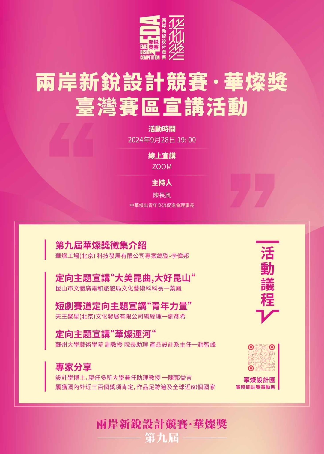 本次活動以線上形式進行,除了詳細介紹華燦獎投稿說明外,更將由定向主題賽道的主理人親自說明創作重點,也特別邀請到設計作品屢獲國內外近三百個獎項肯定,曾榮獲德國紅點獎、iF設計獎、墨西哥國際海報雙年展、莫斯科金蜂獎、美國海報恆星全場恆星獎、全球UDA海報金獎、Graphis等多項指標性獎項的陳郭益言博士。