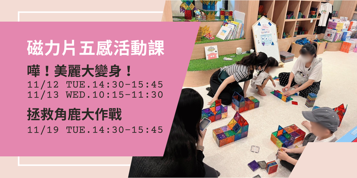 1. 磁力片建構教室&磁力寶貝玩五感:可更換時段至尚有名額的同價位課程,如皆額滿恕無法更換,票券可轉讓他人使用。