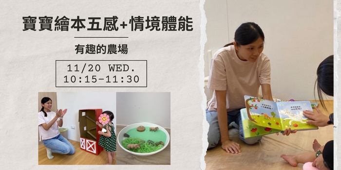 【課程日期】11/20(三) 10:15-11:30 寶寶繪本五感+情境體能-有趣的農場