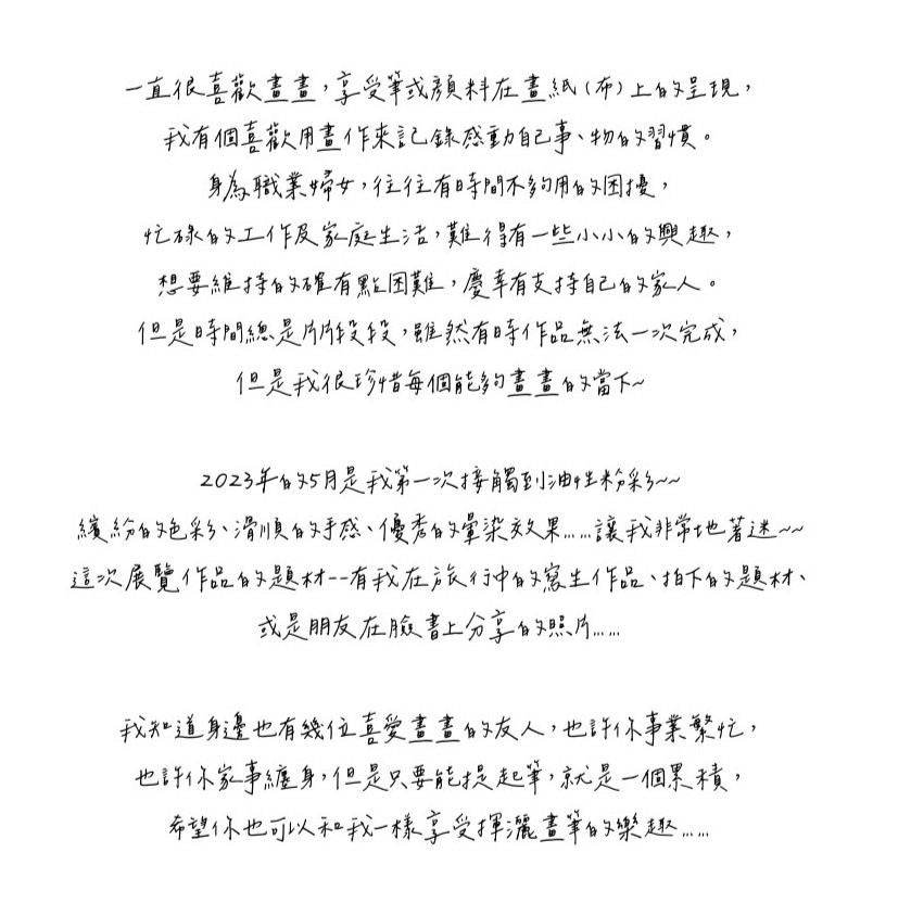 在忙碌的工作與家庭生活中,依然堅持創作,是一份難能可貴的堅持。葉品彣透過油性粉彩紀錄下生活的點滴,她相信,無論您的時間多麼零碎,只要提起畫筆,生活中的美好就能被一筆一劃地累積、記錄。希望透過這次展覽與工作坊,與更多愛好藝術的朋友們分享這份喜悅,一同感受在創作中的寧靜與滿足,更是一場心靈的交流。