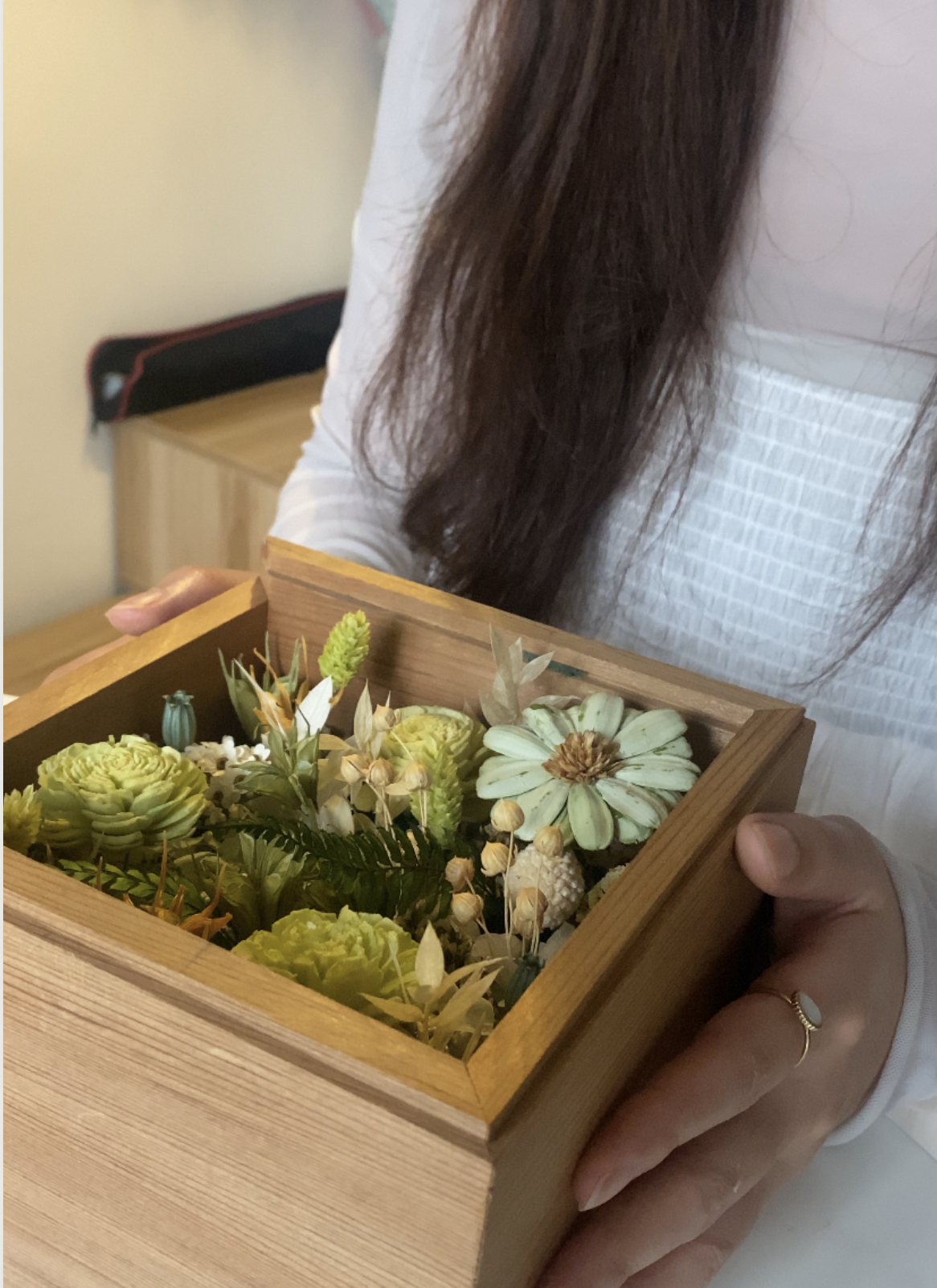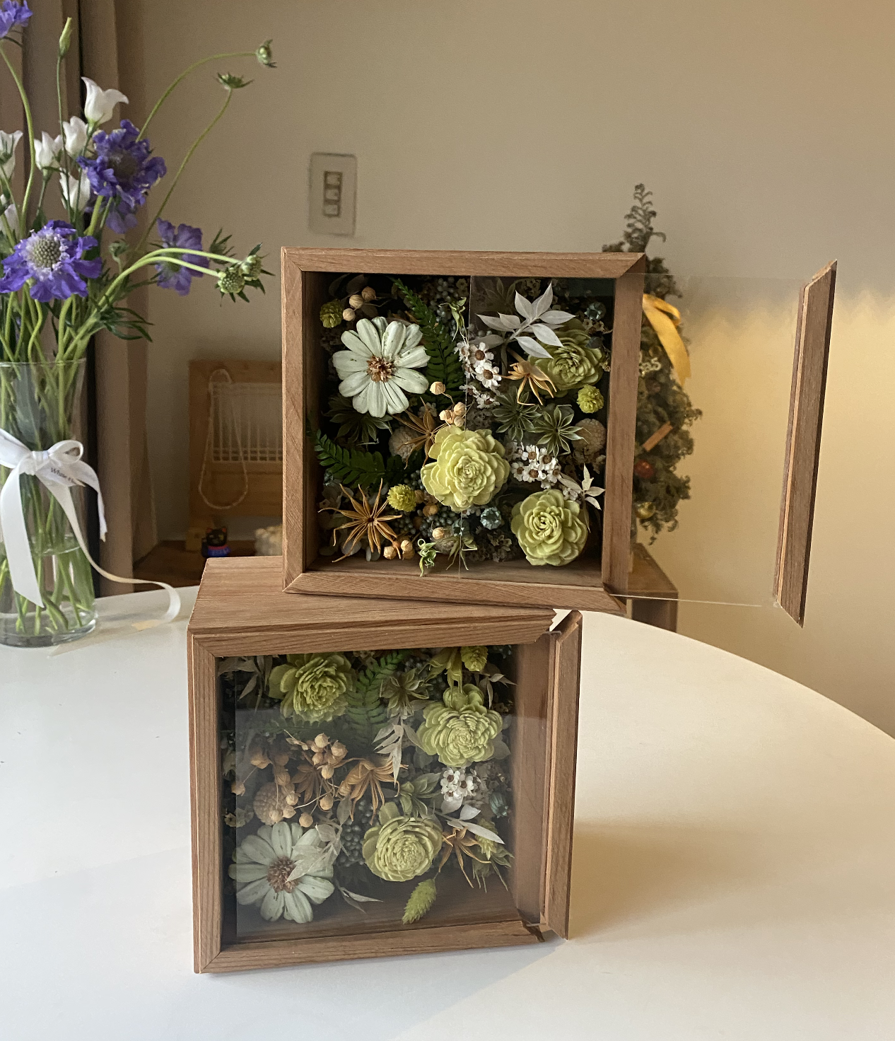 木材選用香杉,具備天然濃郁香氣,材質密度高,色澤呈現深褐色,是製作家具或室內裝潢的高級材料,製作的木盒是為滑蓋木盒,表面有壓克力,在關上蓋子時,既能保護花材,又能不影響欣賞。