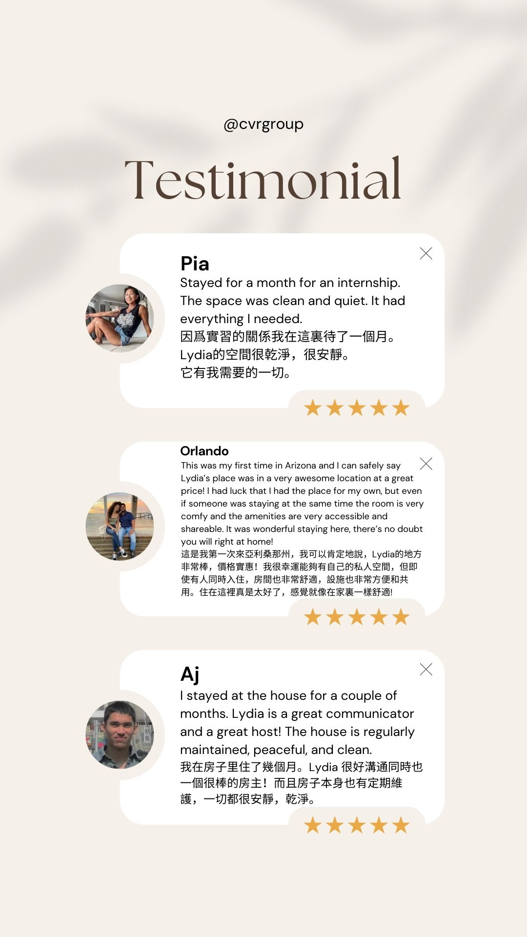 Lydia Lee, 房地產投資人及Airbnb資深房東,亞利桑那州立大學MBA及新竹清華大學經濟研究所雙碩士。自2014年於美國鳳凰城成立Airbnb租房代管服務,至今Campus Vacation Rentals LLC已服務超過800名房客,獲得超過300個公開五星評價,得到Airbnb Super Host超讚房東殊榮