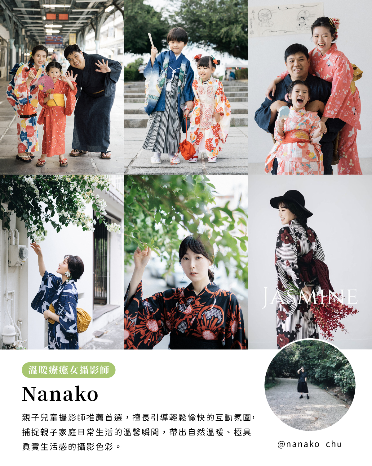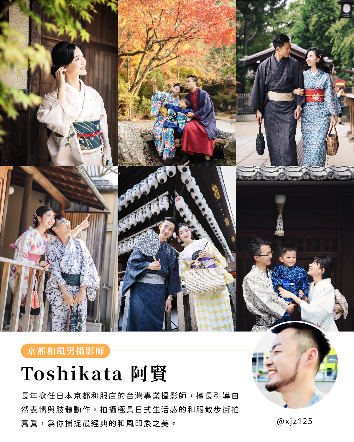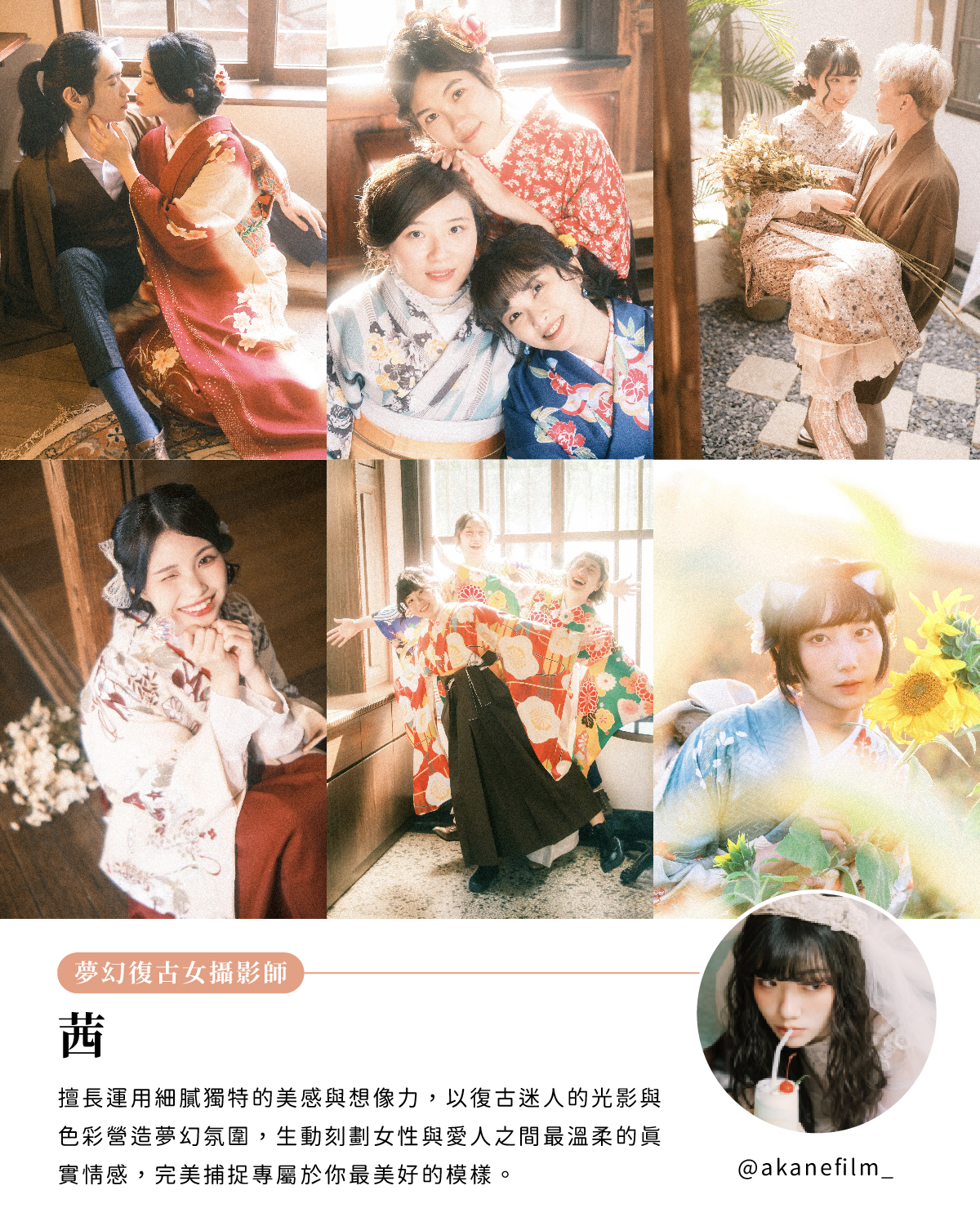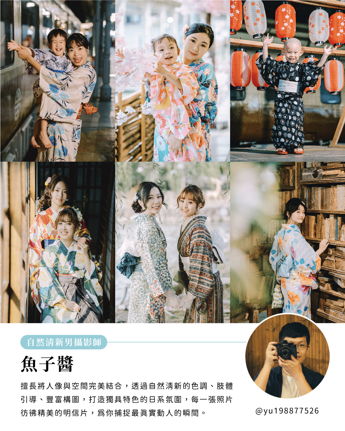 長年擔任日本京都和服店的台灣專業攝影師,擅長引導自然表情與肢體動作,拍攝極具日式生活感的和服散步街拍寫真,為你捕捉最經典的和風印象之美。