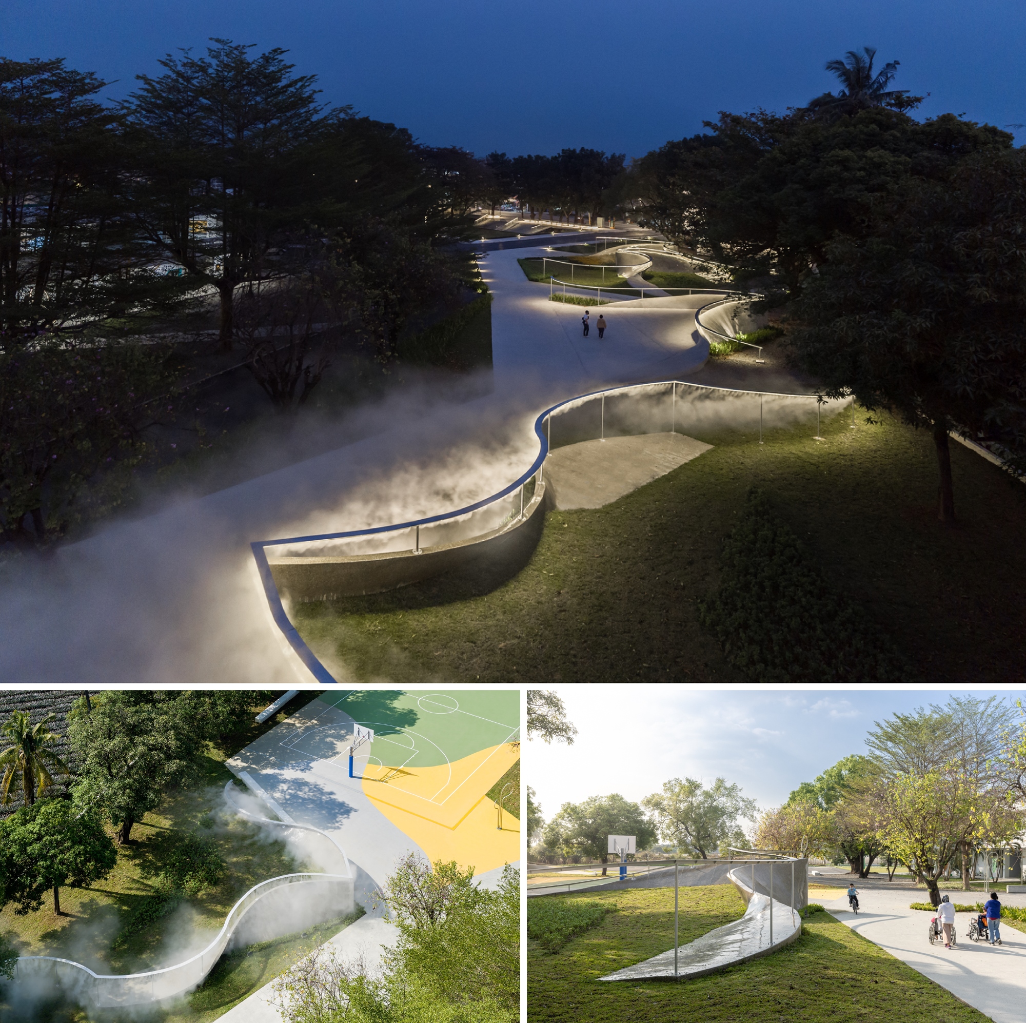南華微光反轉廢棄小學,以農業科技、可食地景創造農業數位科技化的教育創新與創業基地「屏東智慧農業學校」,讓世界看見屏東建築美學與農業科技結合的新實力。建築團隊利用基地退縮,創造省道旁的人行環境空間,園區內以當地常見的環境脈絡轉化成為幾何地景,順應鳳梨田的阡陌紋理,翻摺出大武山脈稜線的想像,將校園轉型為服務社區與高齡者的地景公園。