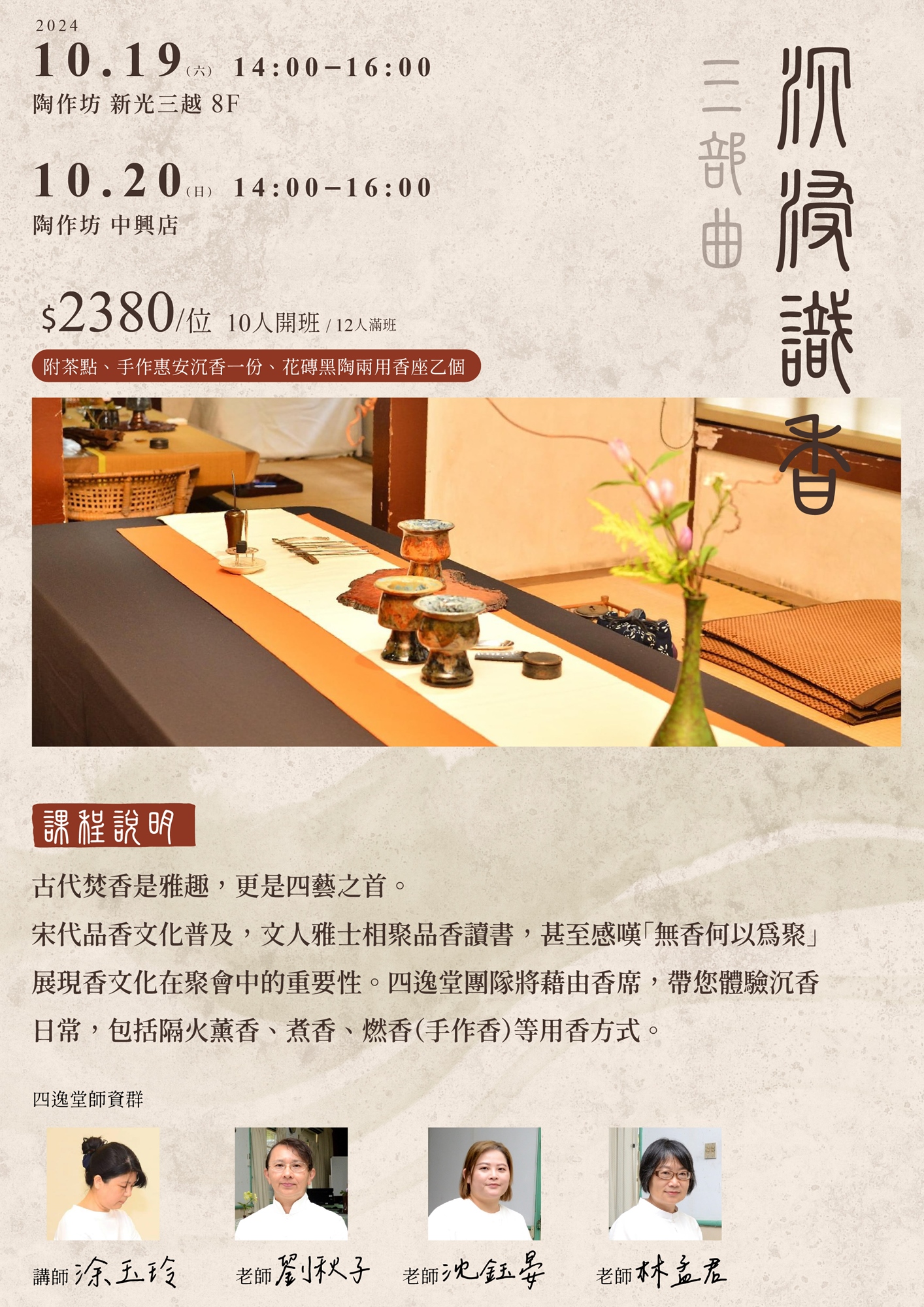 四逸堂團隊將藉由香席與您體驗沉香日常:隔火薰香、煮香、燃香(手作香)等日常用香。