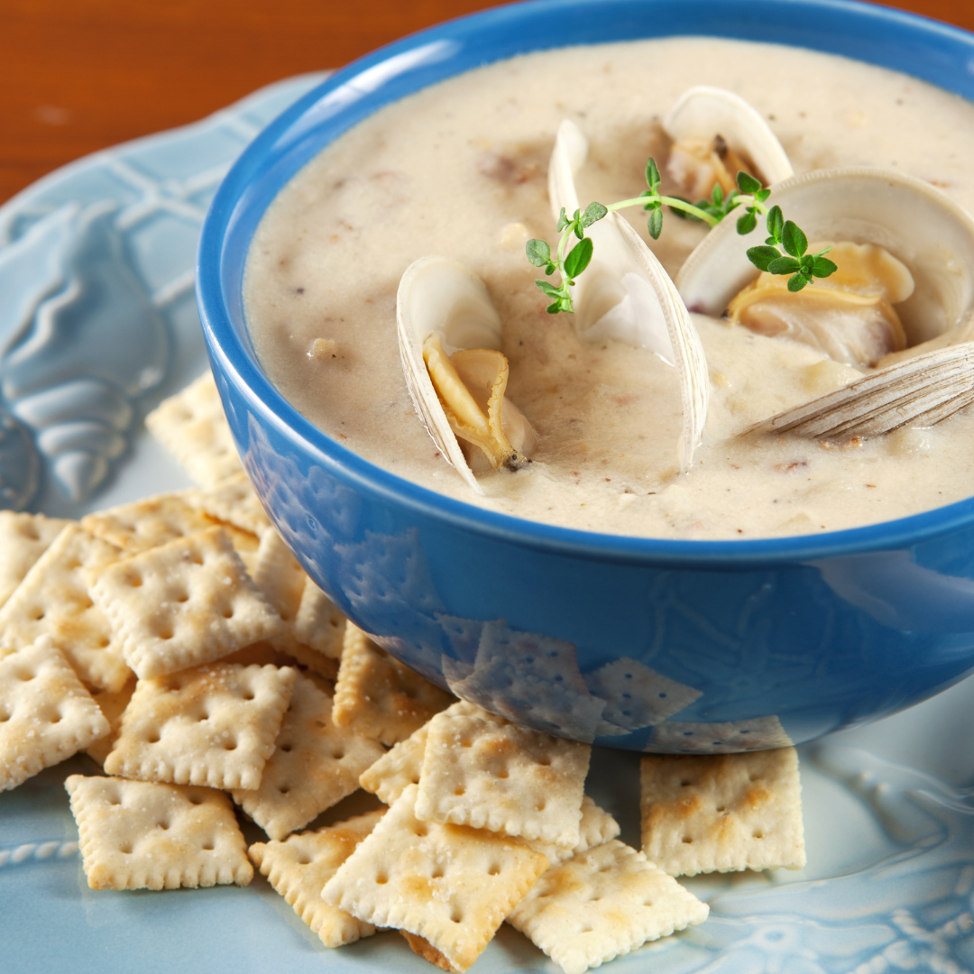 4.蛤蜊巧達濃湯 Clam Chowder:蛤蠣、白酒、洋蔥、培根、馬鈴薯、西洋芹、奶油。