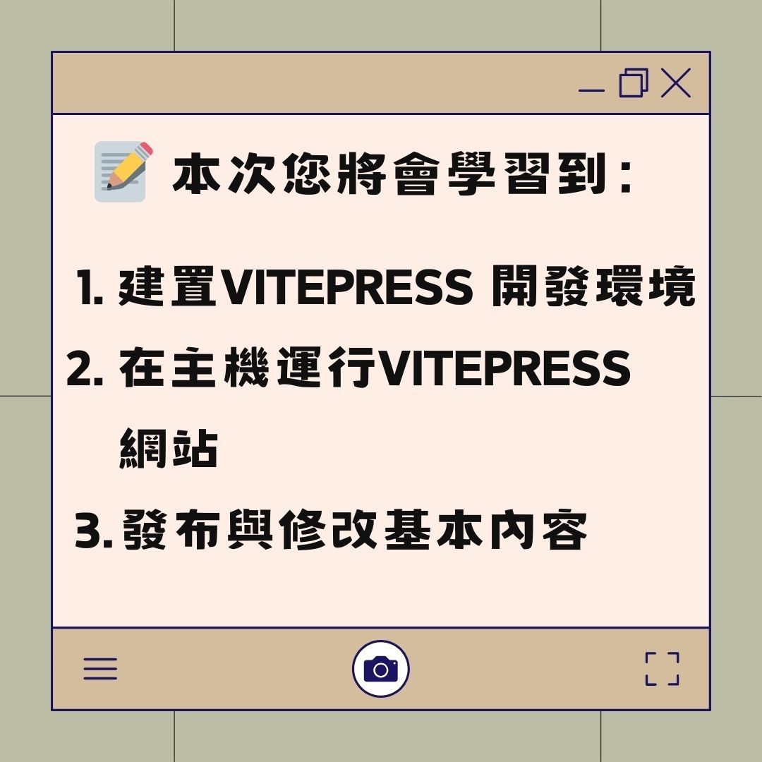 歡迎參加我們的講座活動——《VitePress無本部落格》!在這場講座中,我們將帶您一步步學習如何使用VitePress建立無本部落格,涵蓋環境建置、本機運行、發布與修改,以及進階設定的技巧。